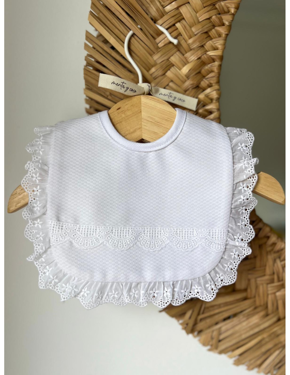 Babero de edición limitada, confeccionado en piqué blanco con delicado entredós y tira bordada, un diseño clásico y atemporal.