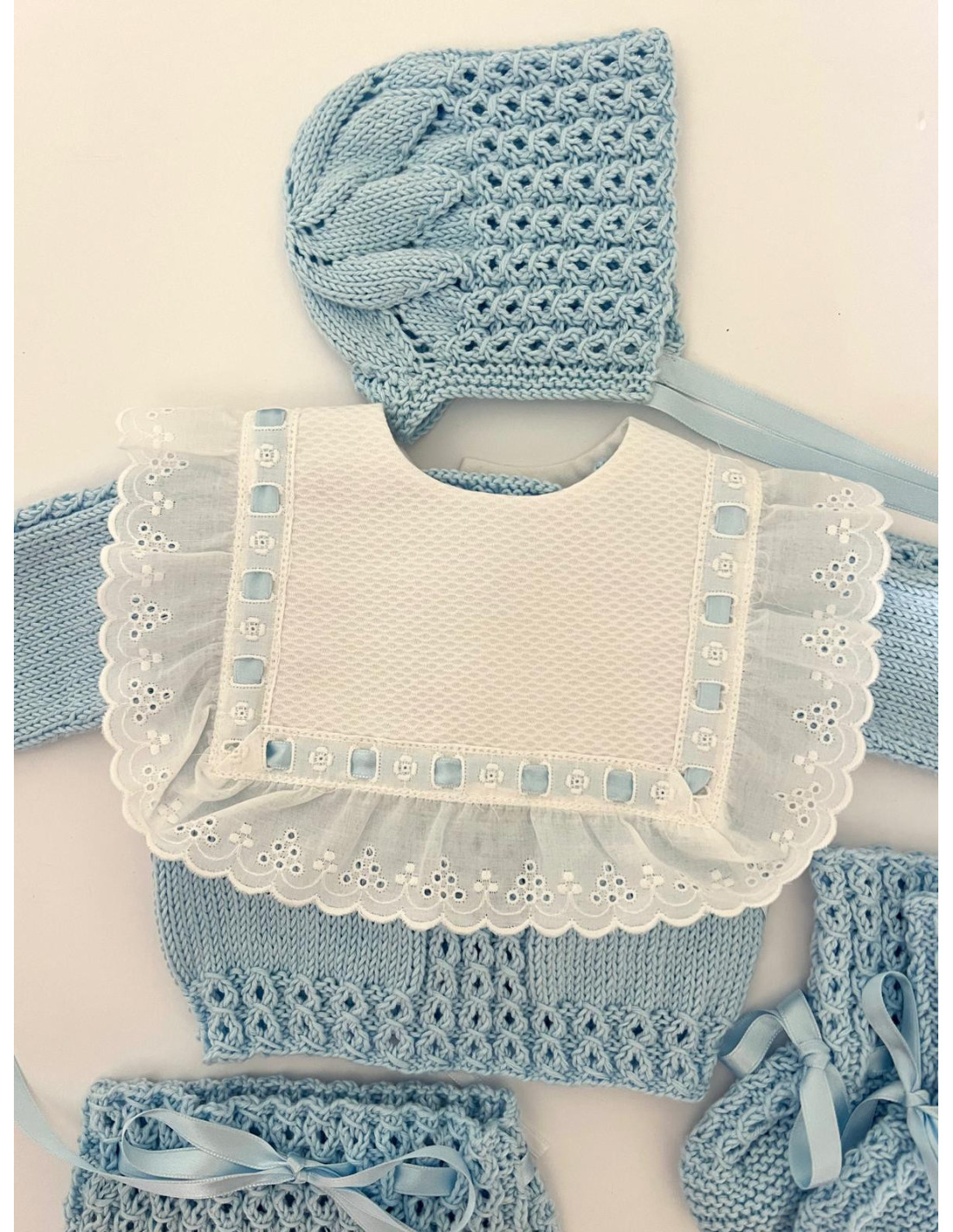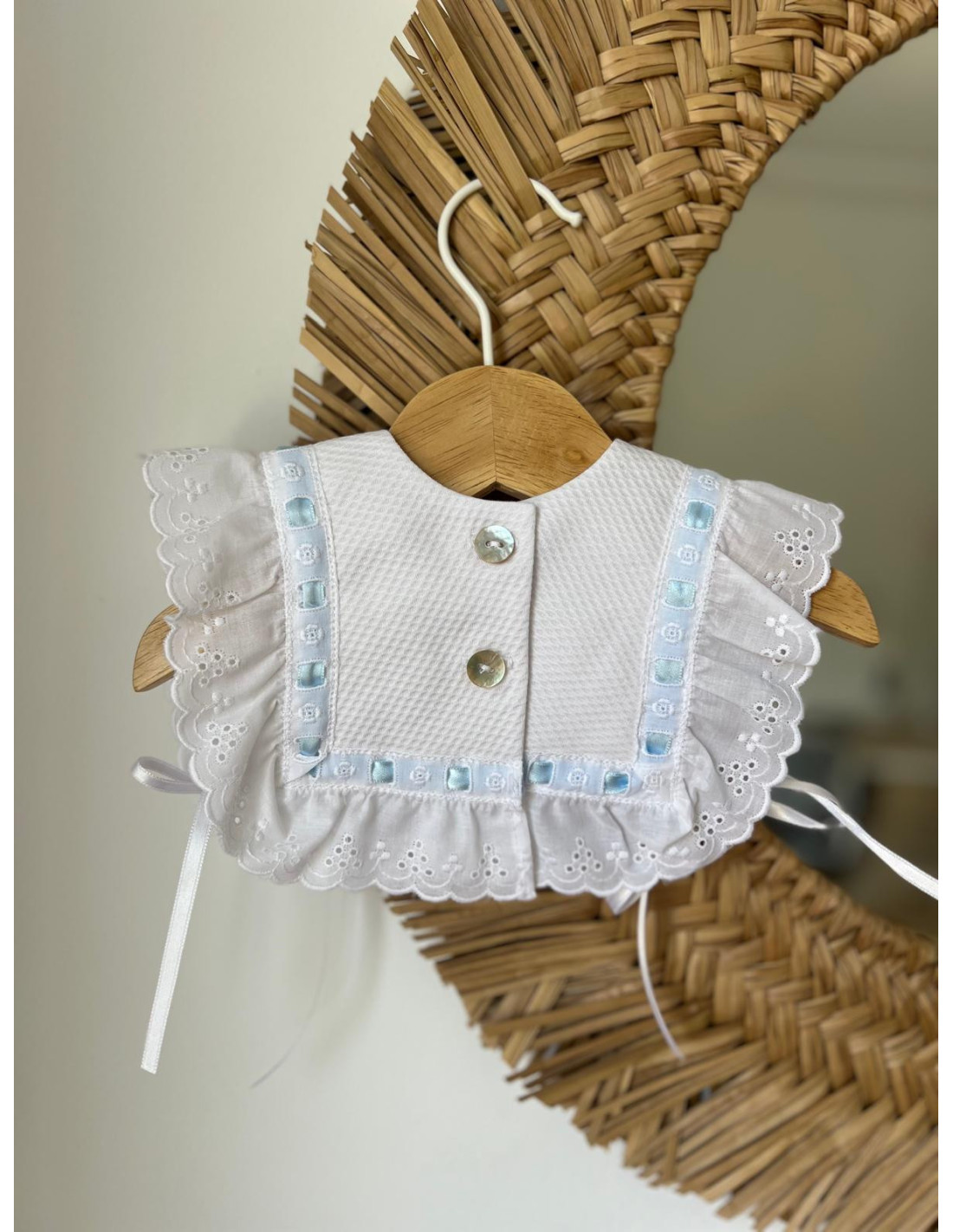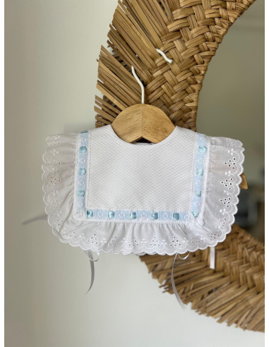 Nuestra baberola clásica, ahora más especial gracias al detalle de pasacintas y un delicado lazo azul, blanco o rosa.