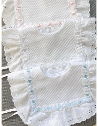Nuestra baberola clásica, ahora más especial gracias al detalle de pasacintas y un delicado lazo azul, blanco o rosa.