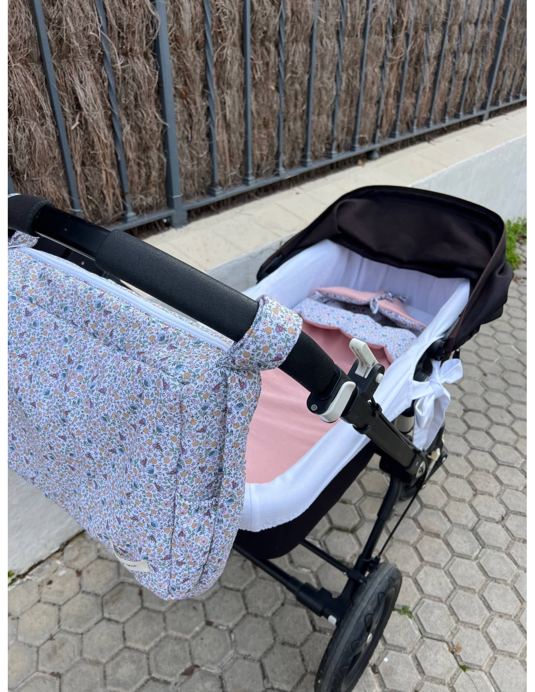 Se agarra al carro con velcros en los laterales, quedando el manillar libre. También cuenta con un asa acolchada, haciéndola más confortable, para colgarnos la bolsa y tener las manos libres.