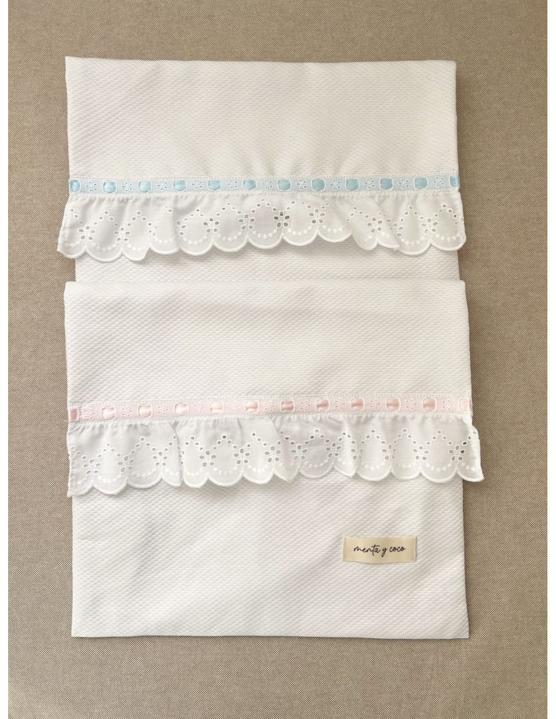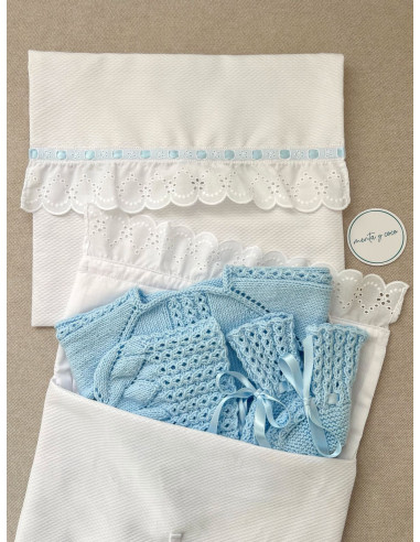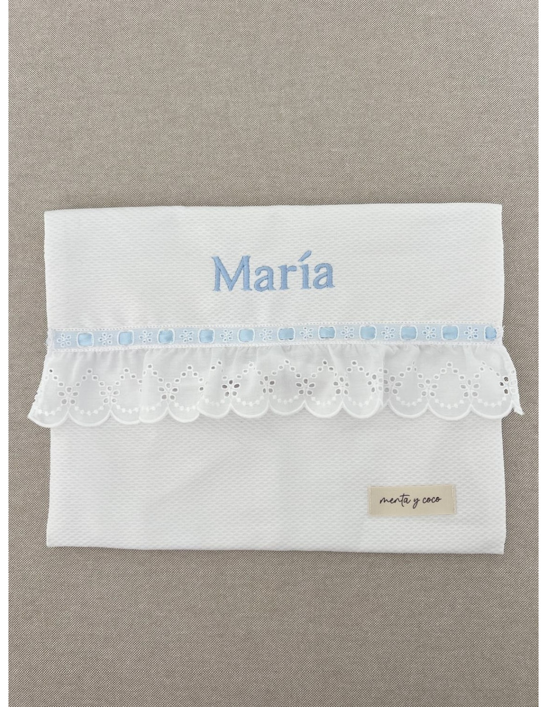 La bolsa de muda de piqué con tira bordada ondas es perfecta para mantener el orden dentro de la maleta del bebé. Su solapa rematada con tira bordada la convierte en una pieza única, elegante y práctica a la vez.