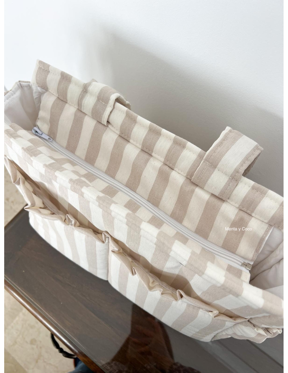 Cuidados: lavar a máquina con agua fría, no usar secadora y planchar a baja temperatura. Para una mejor conservación del tejido evitar la exposición prolongada al sol y para la zona de las asas se pueden usar ganchitos para colgarla y evitar el roce con las manos.