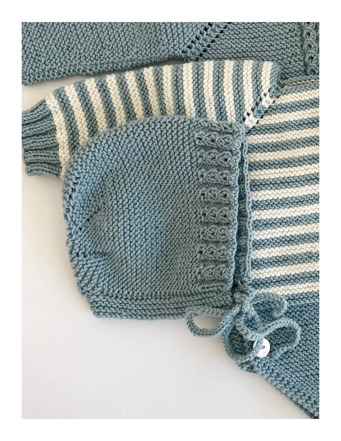 Capota hecha a mano con terminación de ochos y se ajusta al bebé con un lazo. Tiene calados que forman una estrella en la parte posterior. Un imprescindible y recomendada para sus primeros meses.
