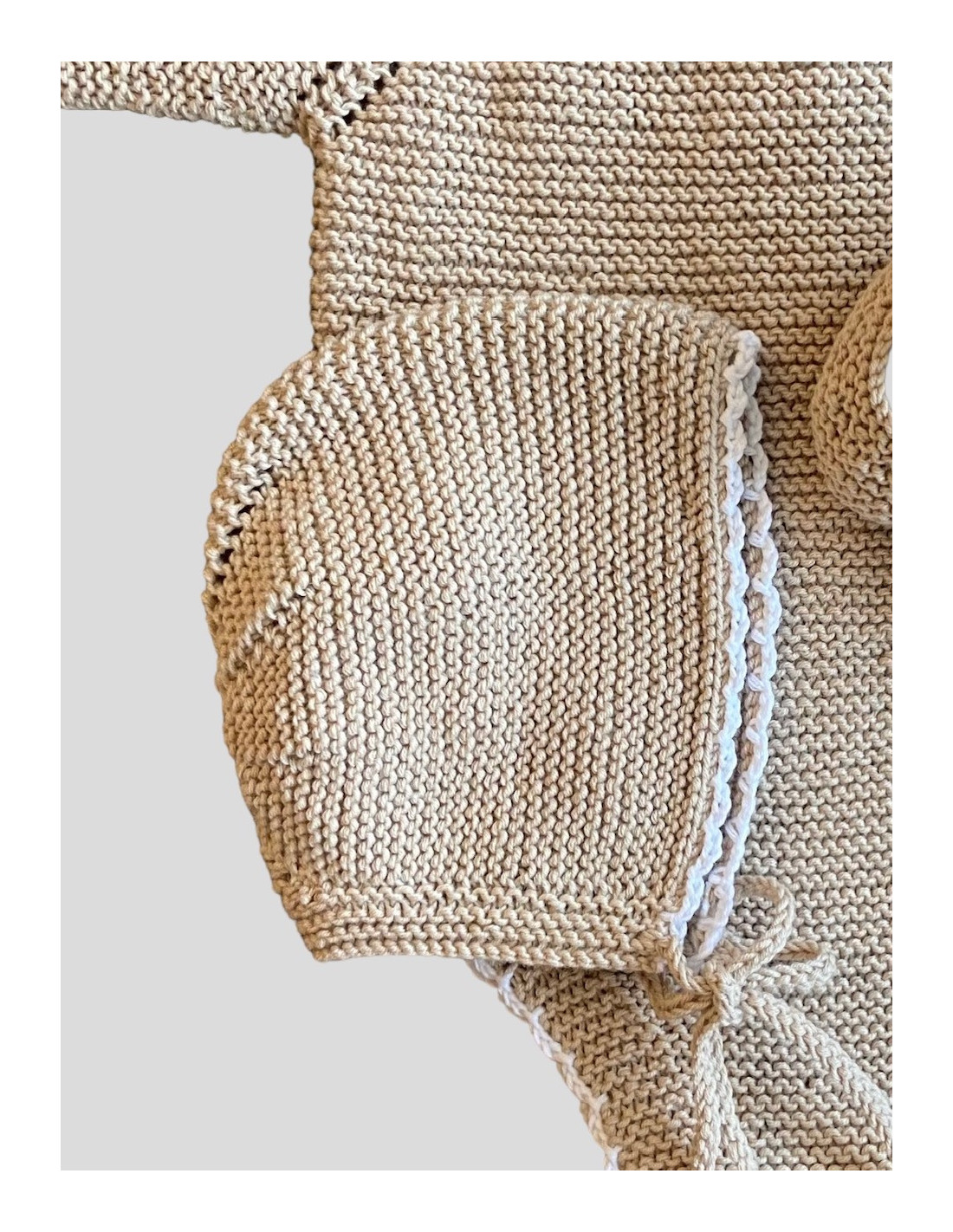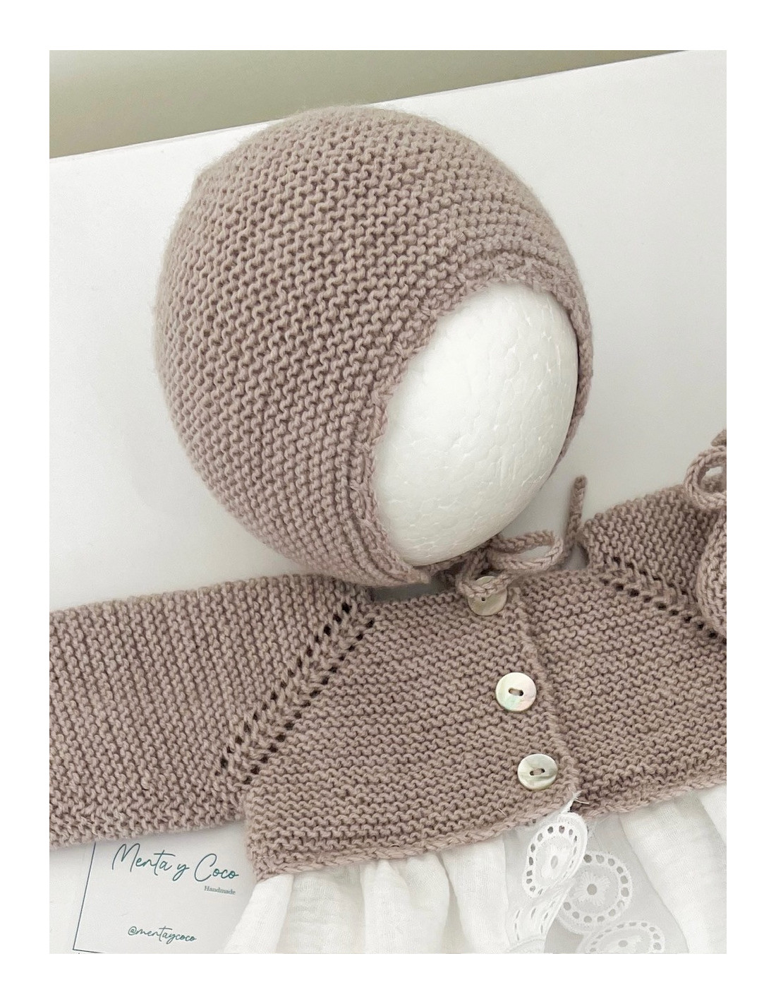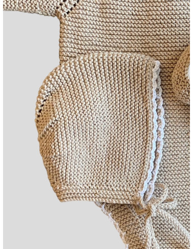 Capota hecha a mano con puntilla en el borde, pudiendo elegir el tono, se ajusta al bebé con un lazo. Tiene calados que forman una estrella en la parte posterior. Son un imprescindible y recomendada para sus primeros meses.