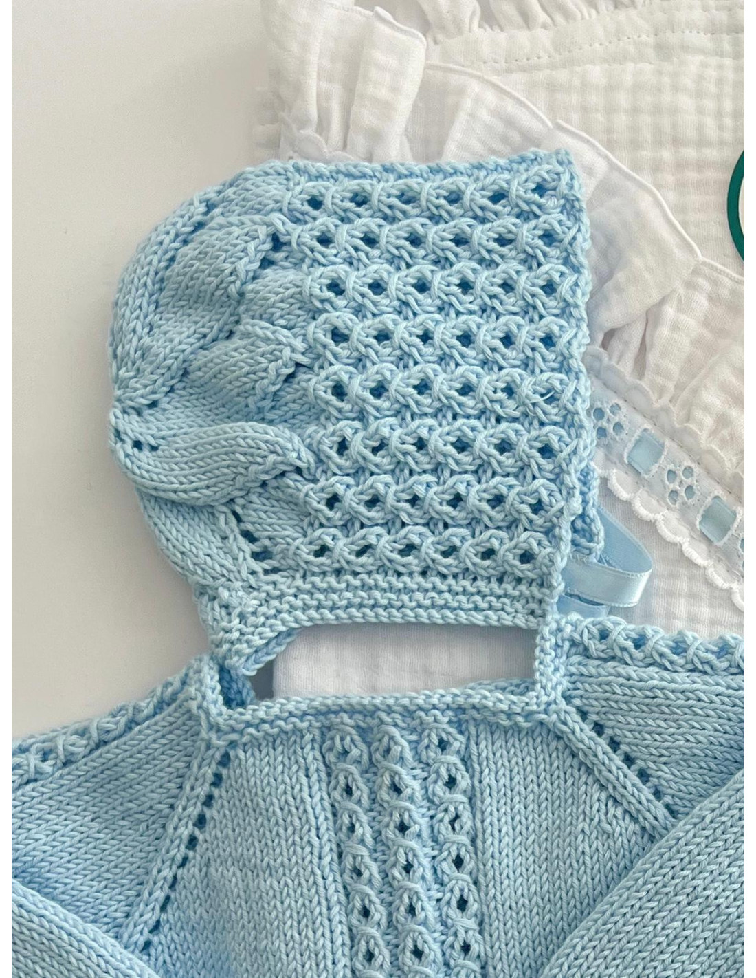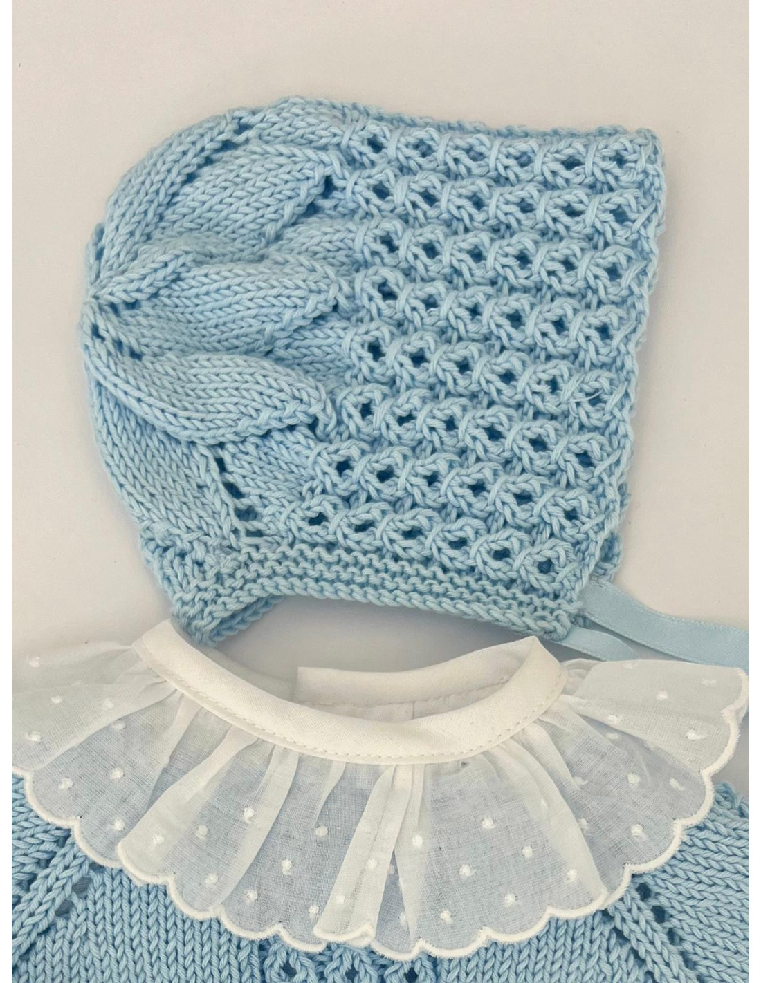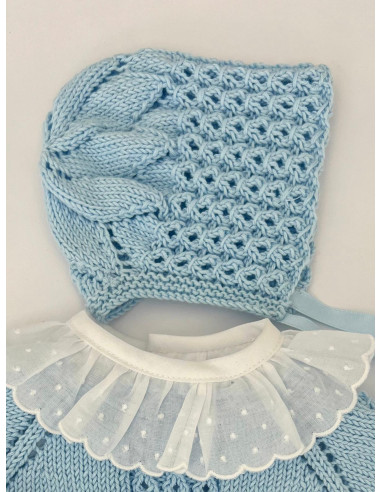 Capota hecha a mano con ochos, se ajusta al bebé con un lazo de punto. Tiene una estrella en la parte posterior que la hace muy especial y diferente. Son un imprescindible y recomendada para sus primeros meses.