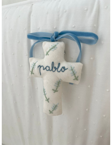 Nuestra cruz bordada, personalizada es un detalle único hecho a mano. Cada pieza está confeccionada de manera artesanal, cuidando cada puntada para crear un recuerdo especial y atemporal.