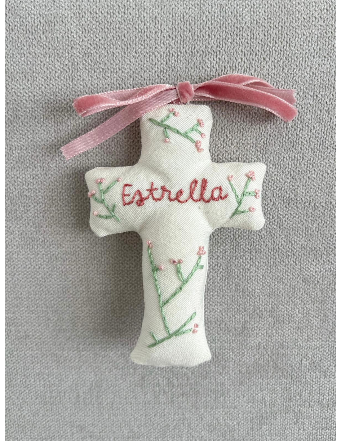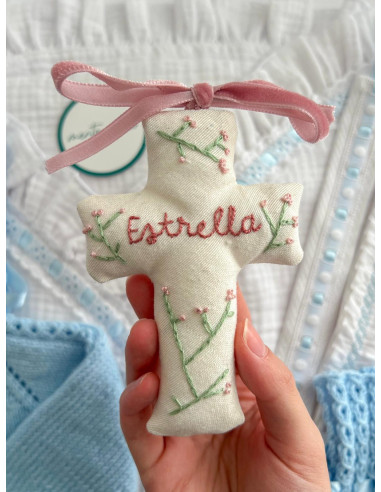 Nuestra cruz bordada, personalizada es un detalle único hecho a mano. Cada pieza está confeccionada de manera artesanal, cuidando cada puntada para crear un recuerdo especial y atemporal.