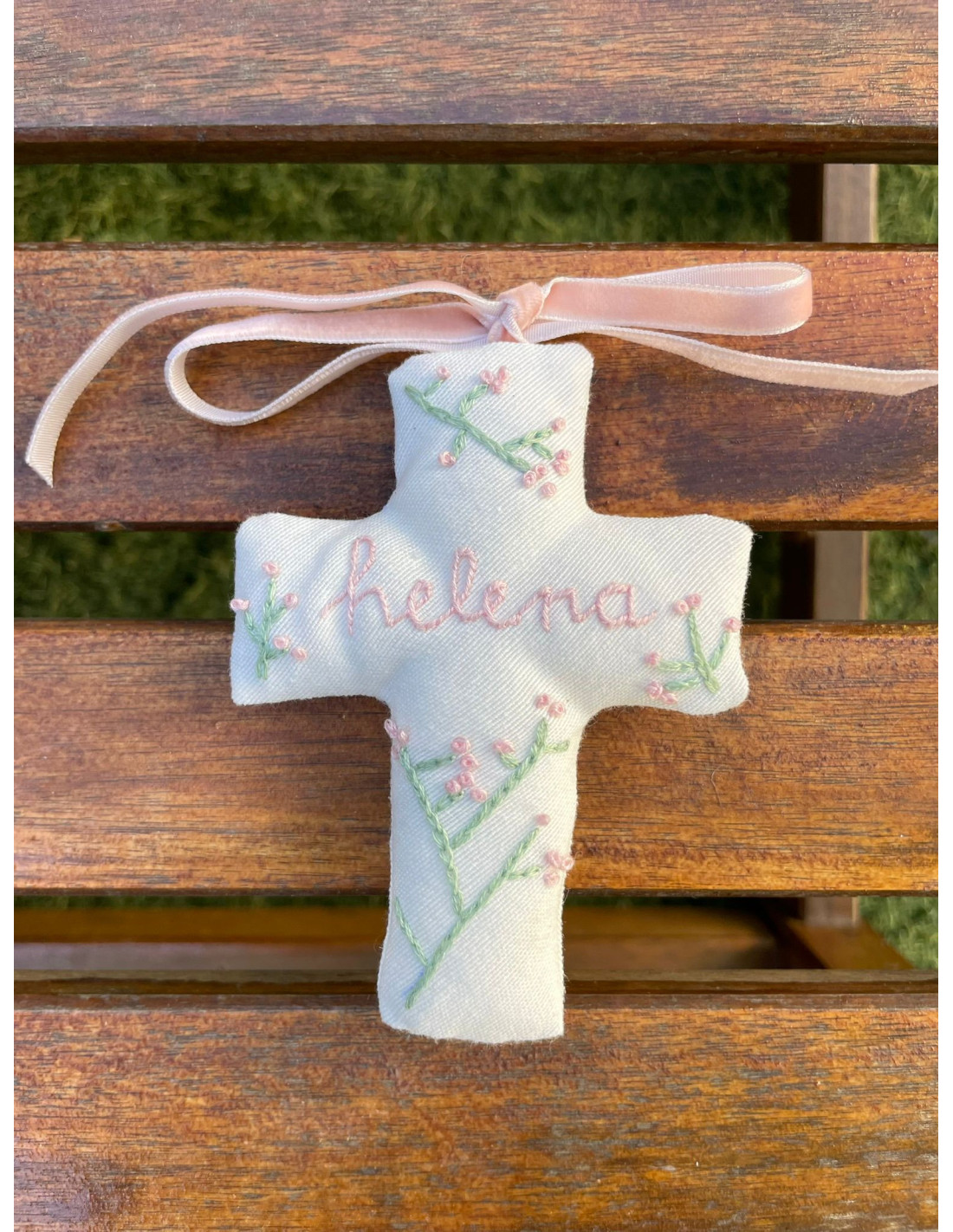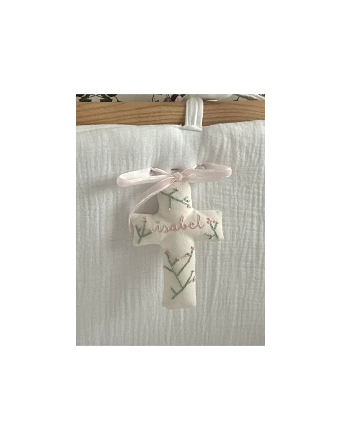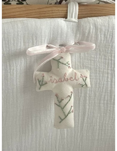 Cruz bordada rosa bebé