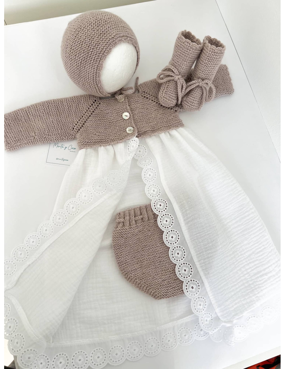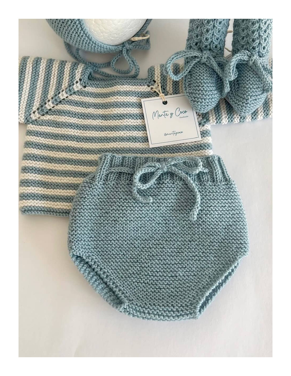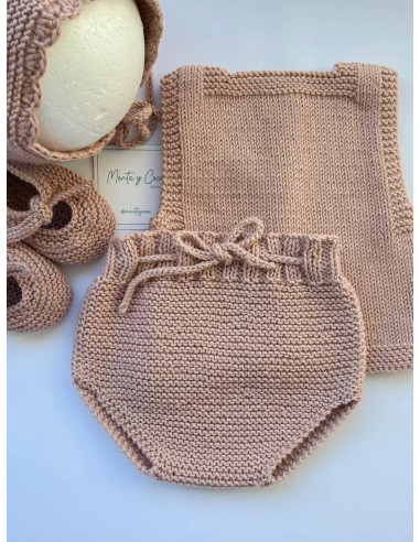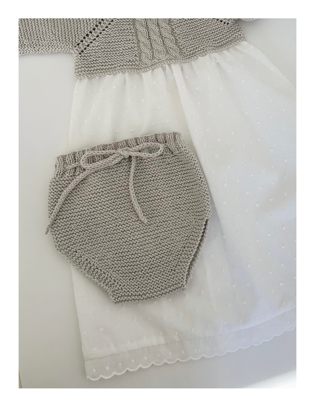 Cubrepañal tejido a mano que se ajusta al bebé con un lazo de punto. Perfecto para combinar con cualquier conjunto, así como faldones.