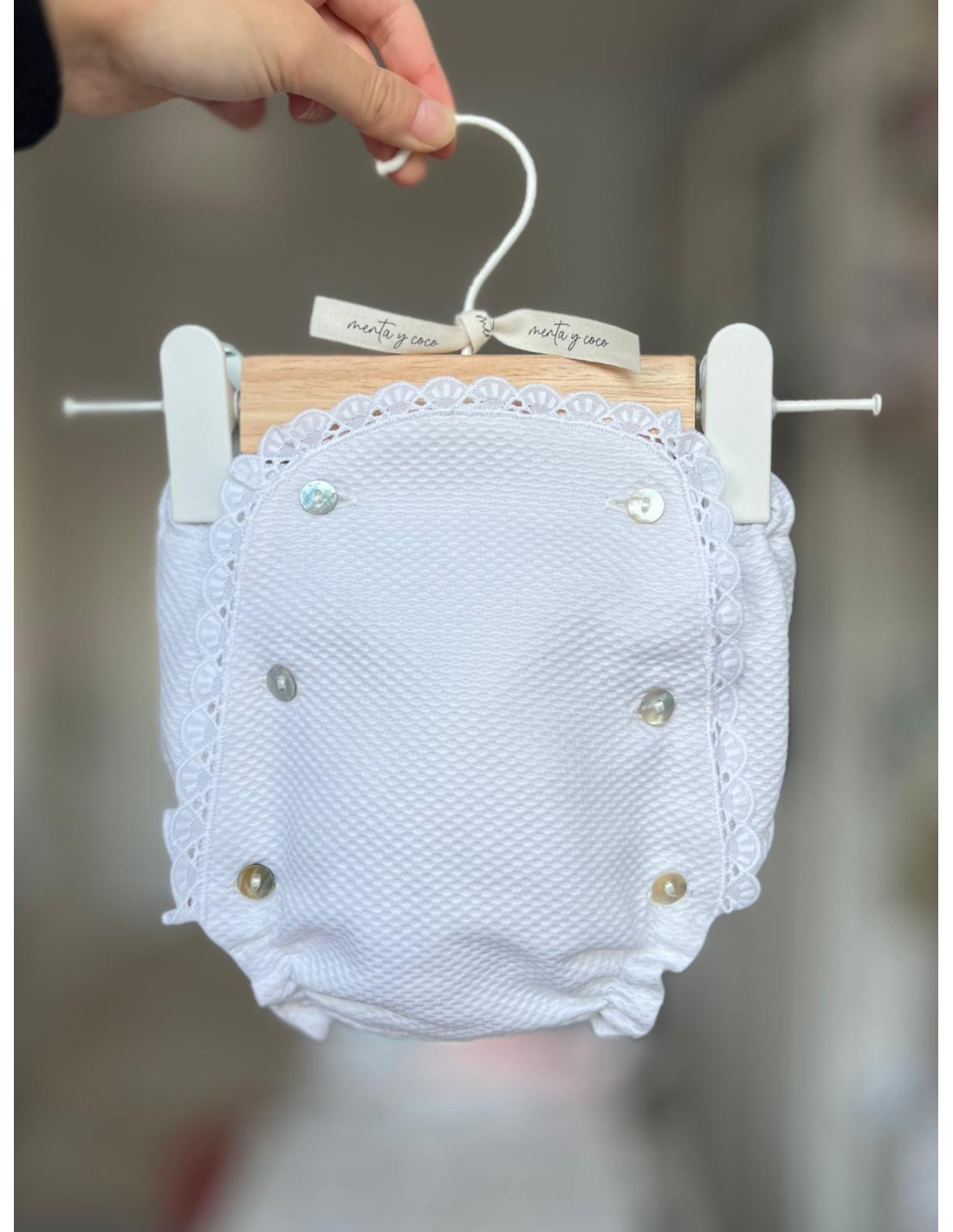 Cubrepañal confeccionado en piqué blanco con tira bordada y botones de nácar que aportan un acabado clásico y muy especial.