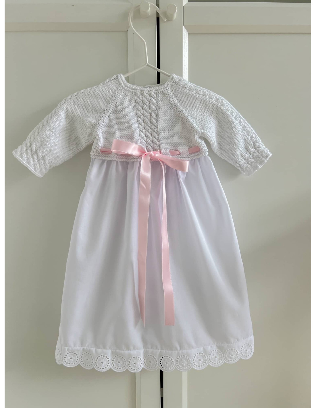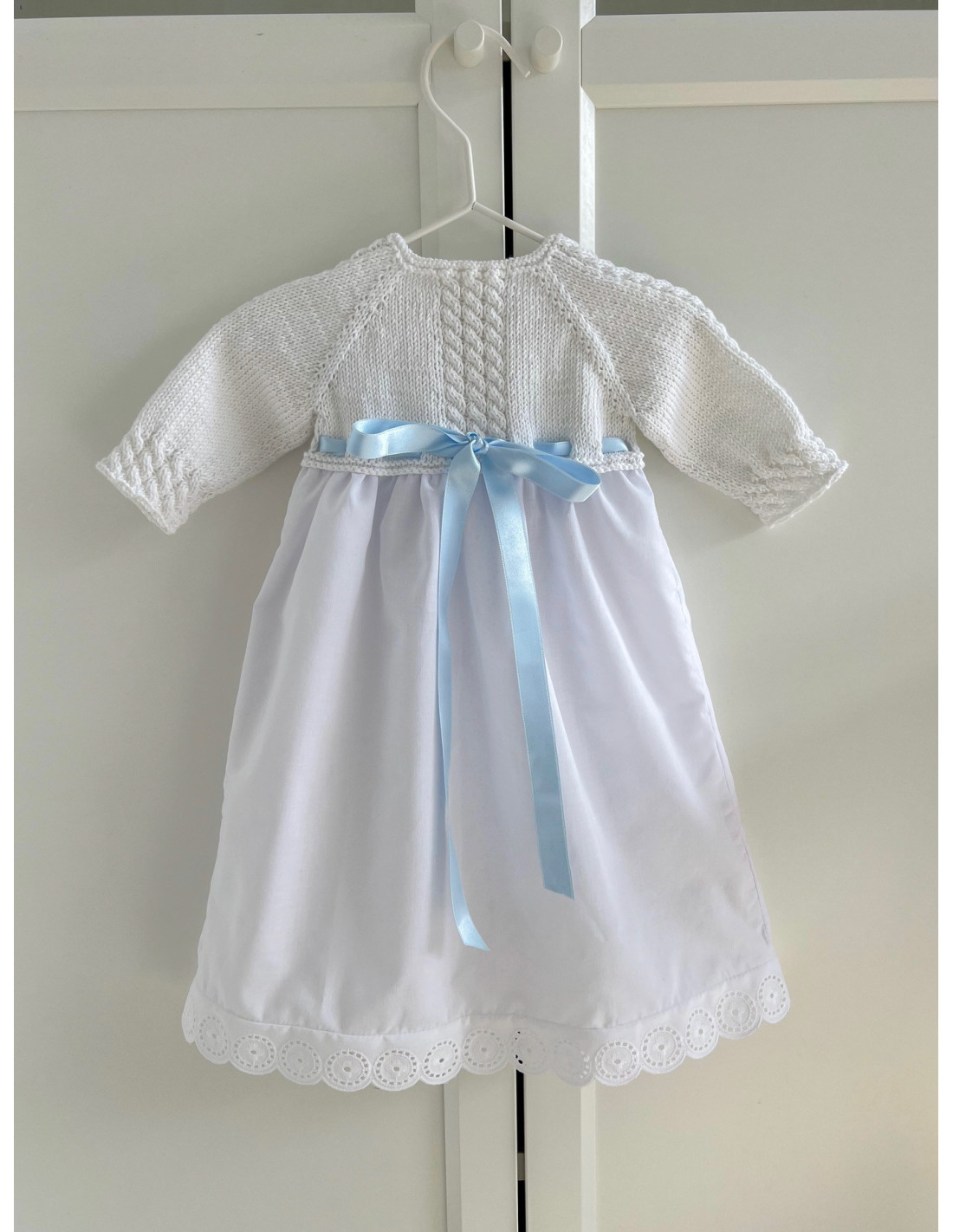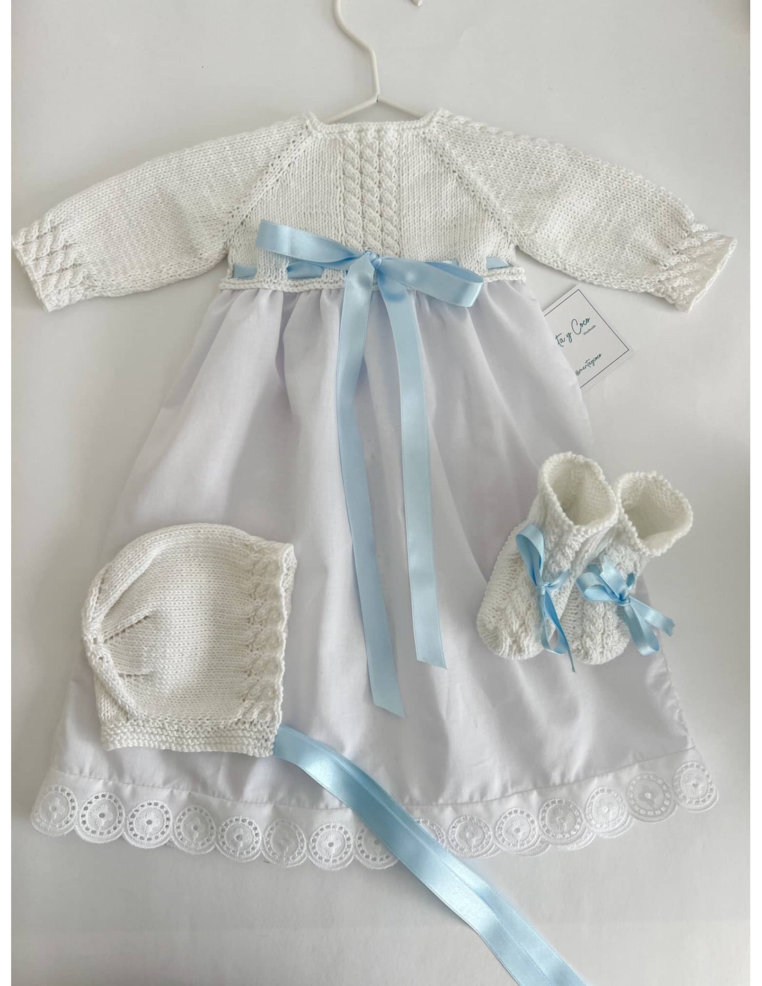 Faldón hecho mano, tiene trencitas en las mangas y el cuerpo. Tiene tira bordada en el bajo y los laterales y lazo (color a elegir) haciéndolo más especial. Se abrocha por detrás con 3 botones de nácar.
