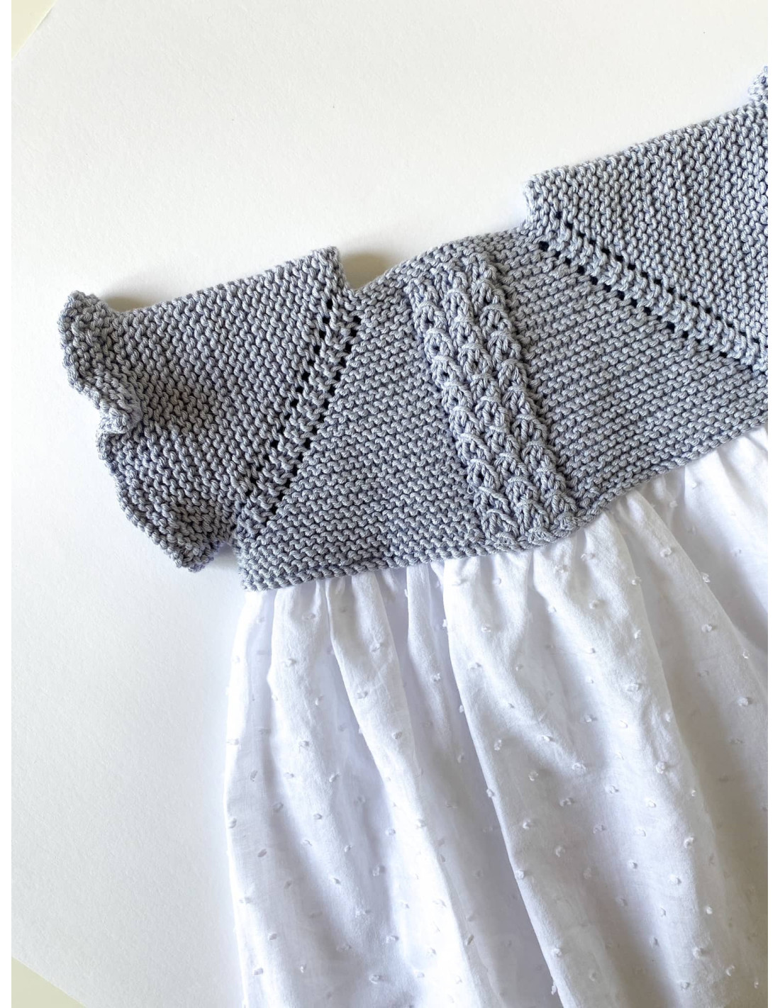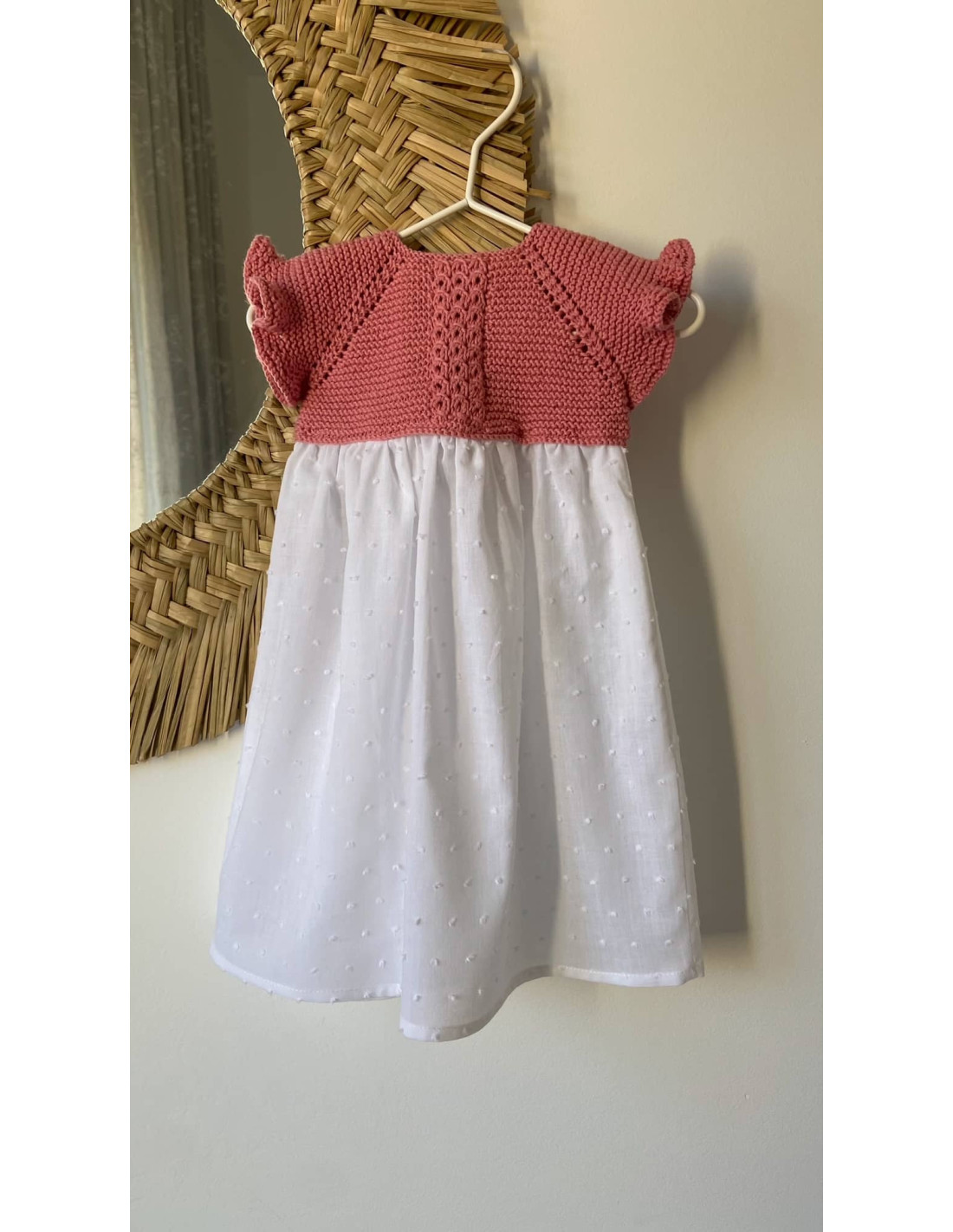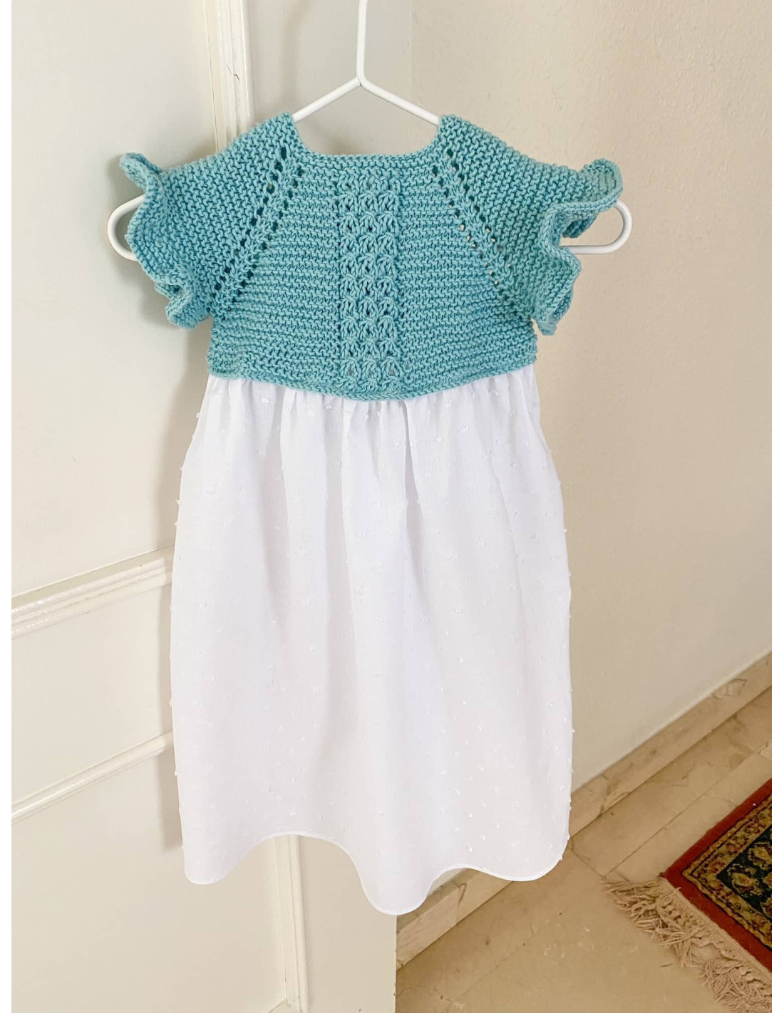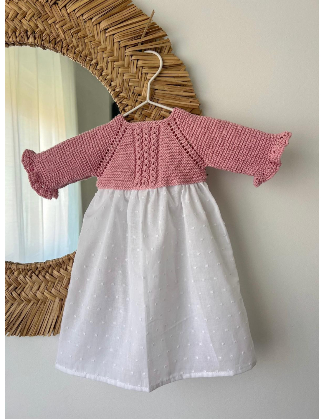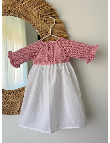 Faldón hecho a mano, con ochos y volante, se abrocha por detrás con 3 botones de nácar. Personaliza el color y el tejido.