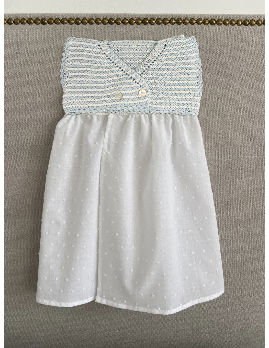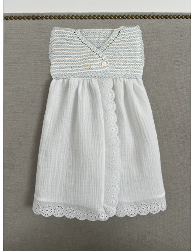 Faldón MER de rayas blancas y azul bebé, talla 1-3m. Se puede comprar a parte la capota y patucos para completar el conjunto, , al igual que el cubrepañal de tela (no incluido en el precio).