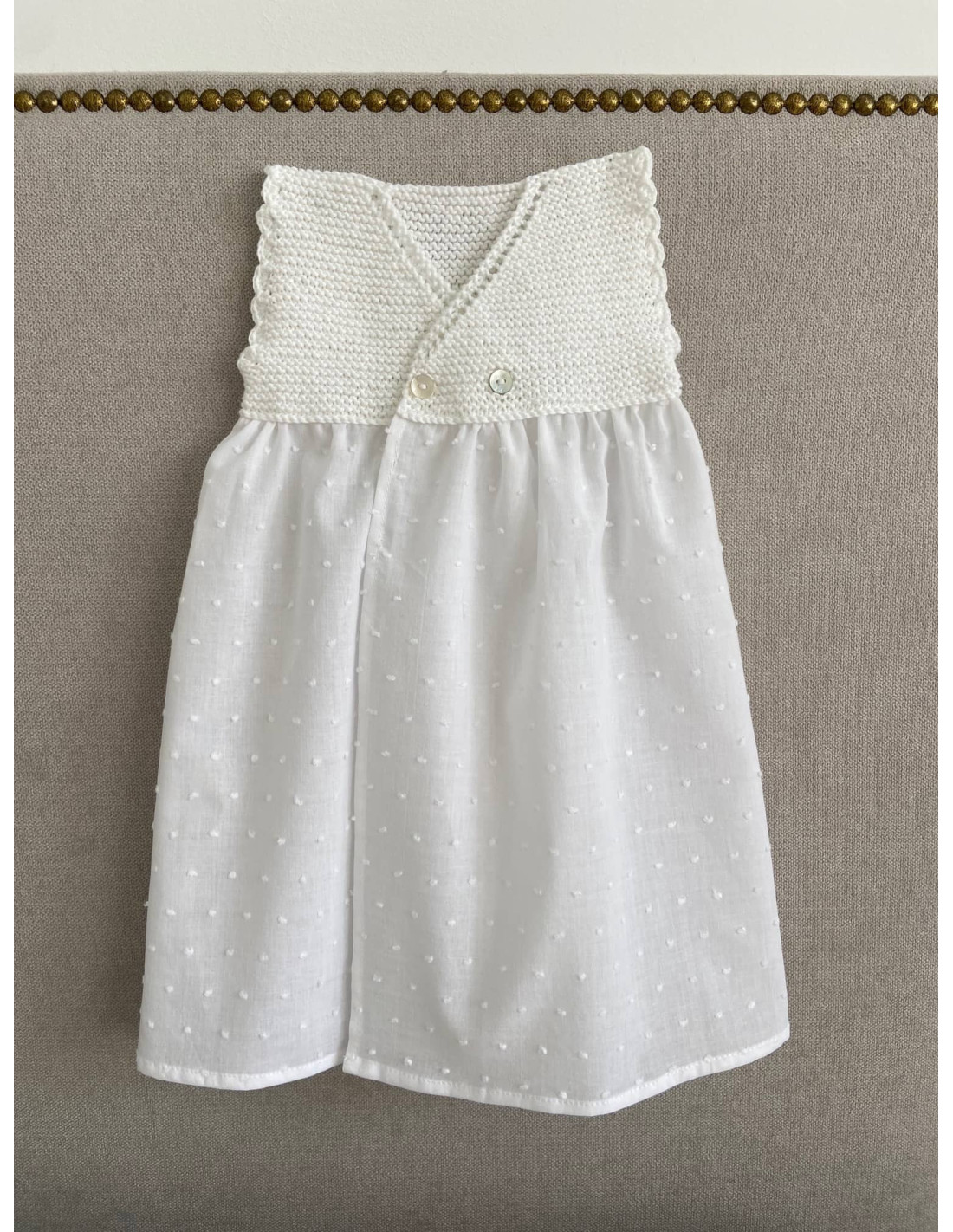 MER, uno de los modelos icónicos y más pedidos cada temporada. Faldón cruzado hecho a mano, con un detalle muy bonito en la manga, se abrocha por delante con 2 botones de nácar. Personaliza el color y el tejido.