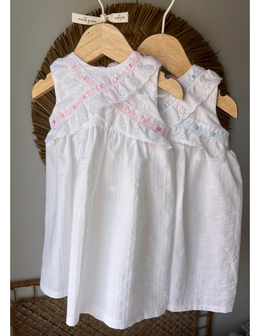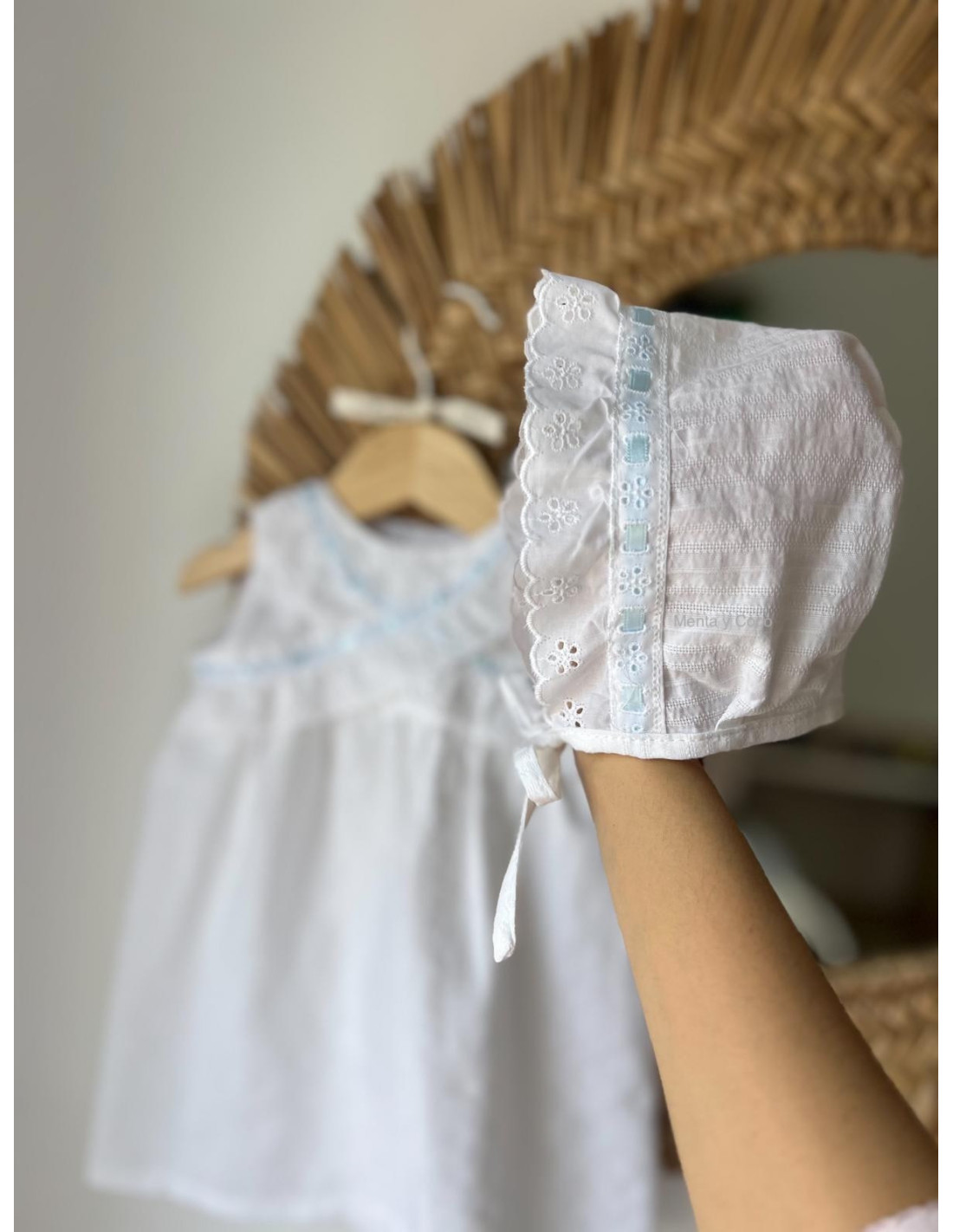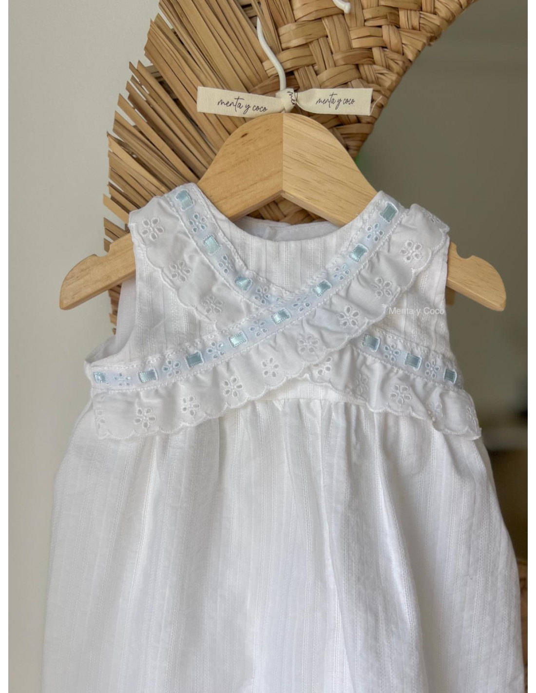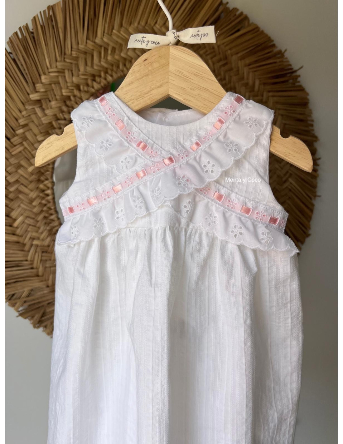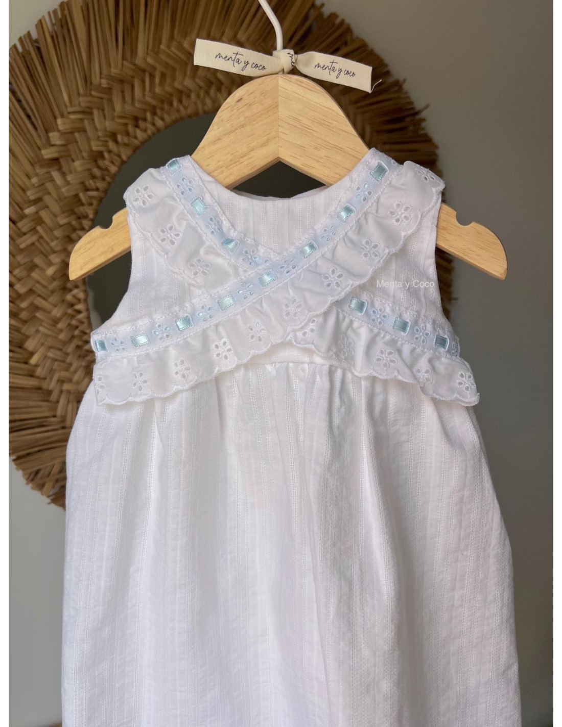 Delicado faldón con pasacintas y tira bordada.