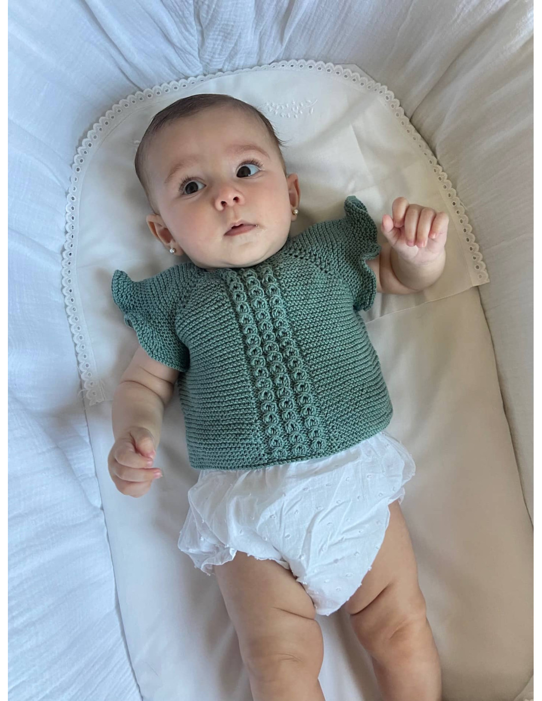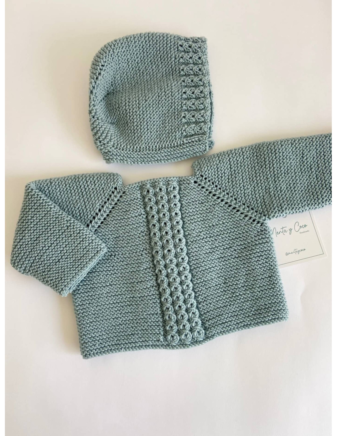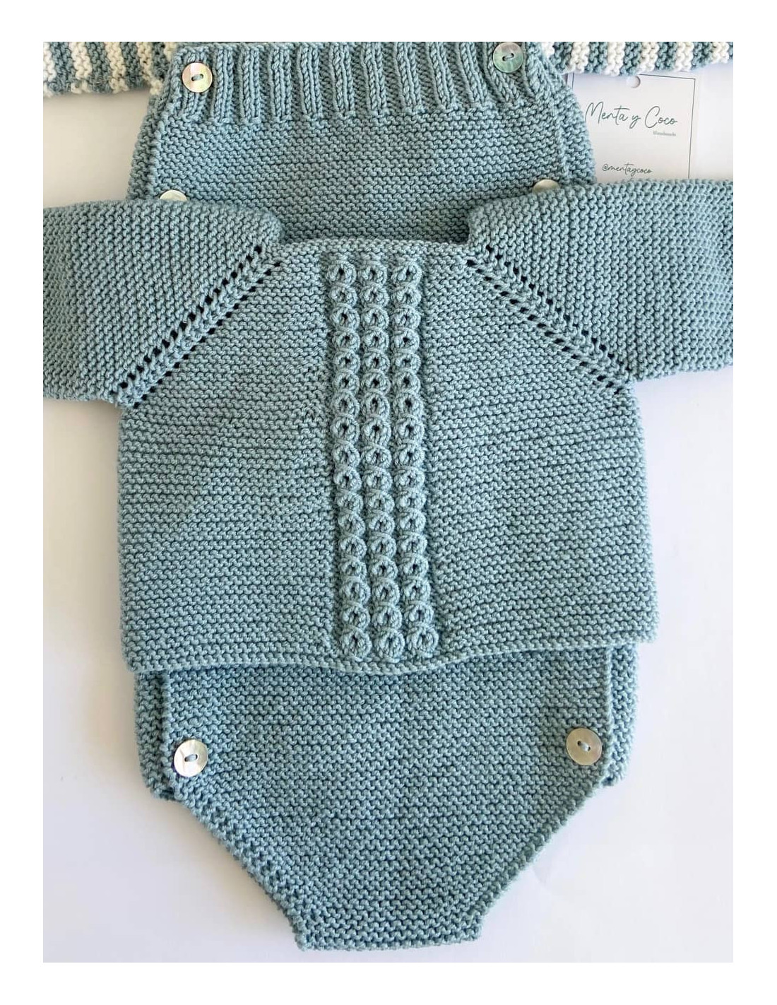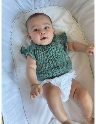 Jersey hecho a mano ochos en el centro que se abrocha con botones de nácar, pudiéndose usar tanto de rebeca abrochada hacia delante como de jersey. Personalízalo como más te guste y completa el conjunto con los accesorios a juego.