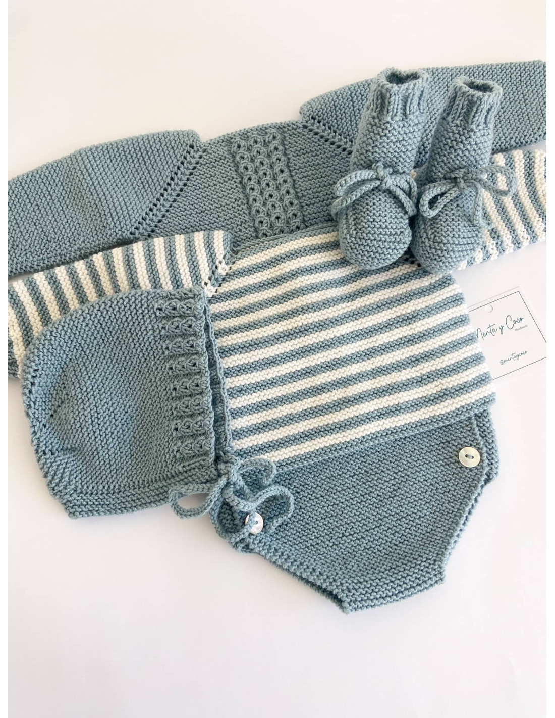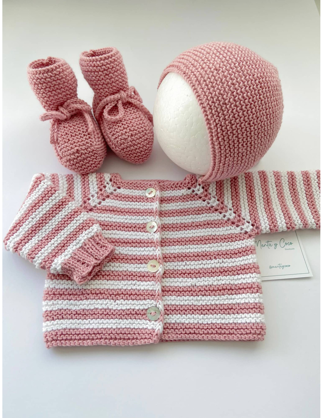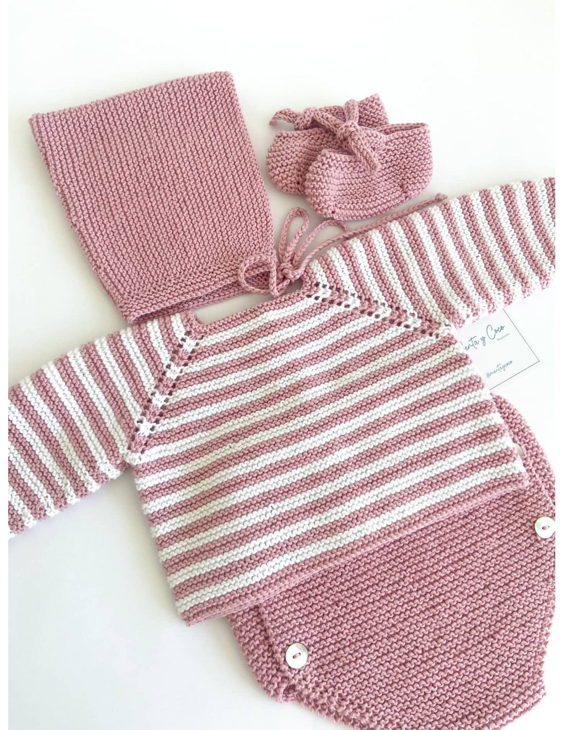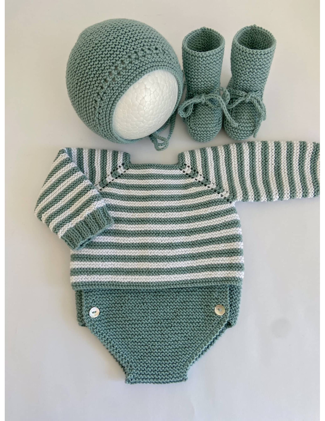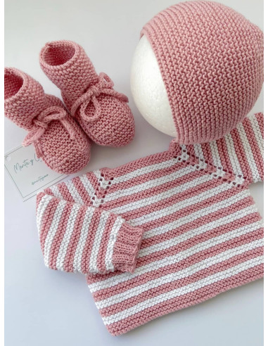 Uno de nuestros modelos más icónicos hecho a mano. Jersey de rayas que se abrocha con botones de nácar, pudiéndose usar tanto de rebeca abrochada hacia delante como de jersey. Personalízalo como más te guste y completa el conjunto con los accesorios a juego. (no incluidos) El color que elijas siempre irá combinado con blanco (blanco merino (roto) en caso de lana).
