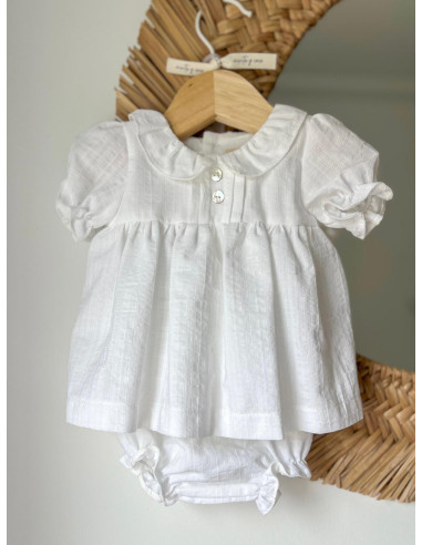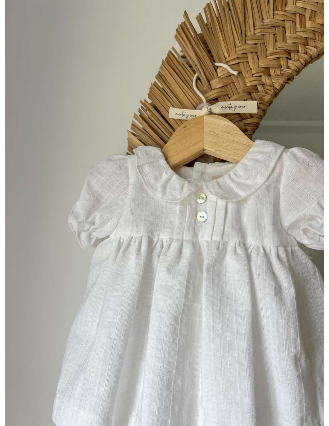 Jesusito confeccionado en un tejido con relive, destaca por sus botones de nácar y jaretas que lo hacen diferente.