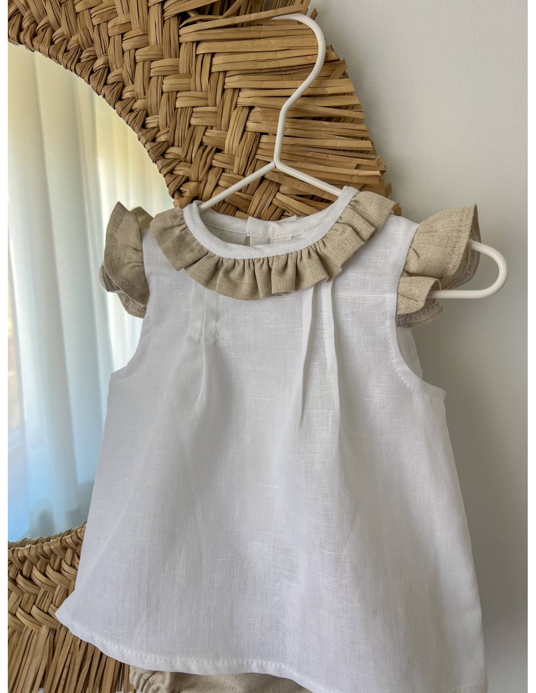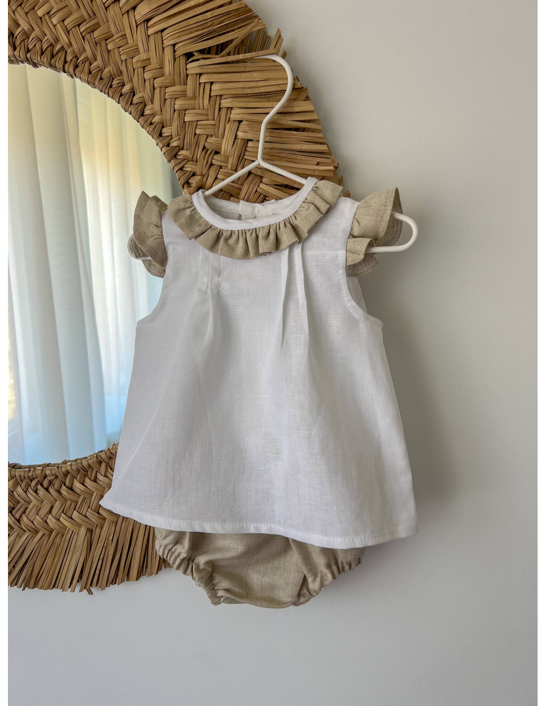 Jesusito lino con el detalle del cuello y volante en la manga en color natural y jaretas en cuerpo haciéndolo más original y diferente. Incluye cubrepañal.