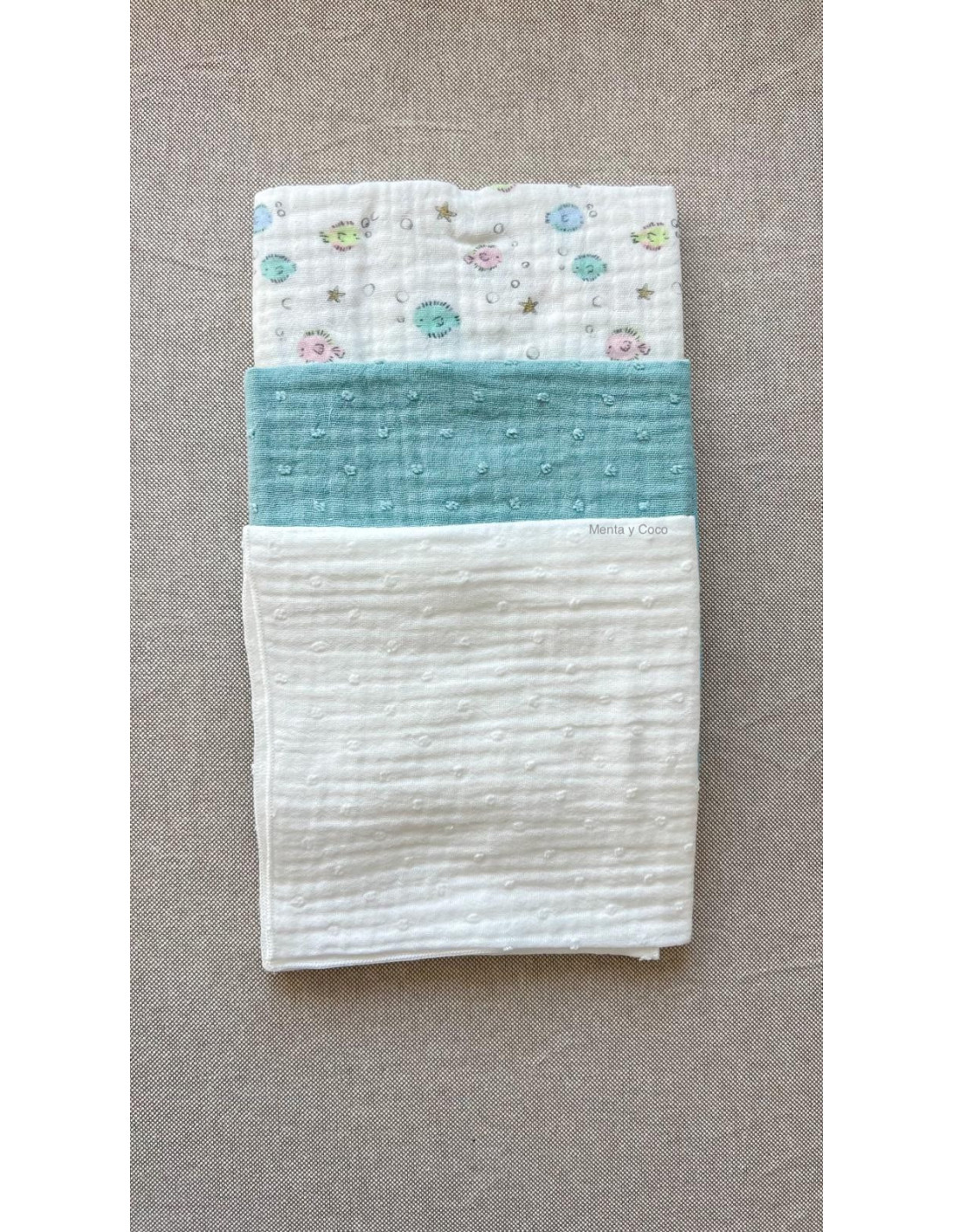 Nuestro pack de 3 gasas de bambula es un básico imprescindible para el día a día del bebé. Incluye una gasa estampada, una blanca y una de color.