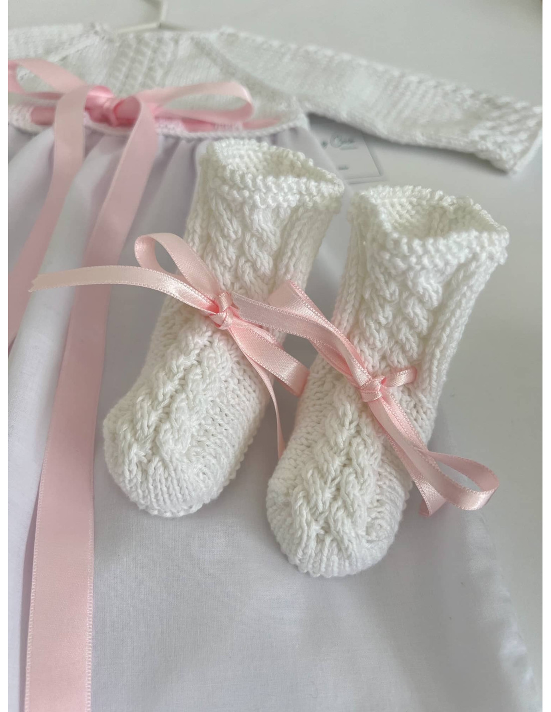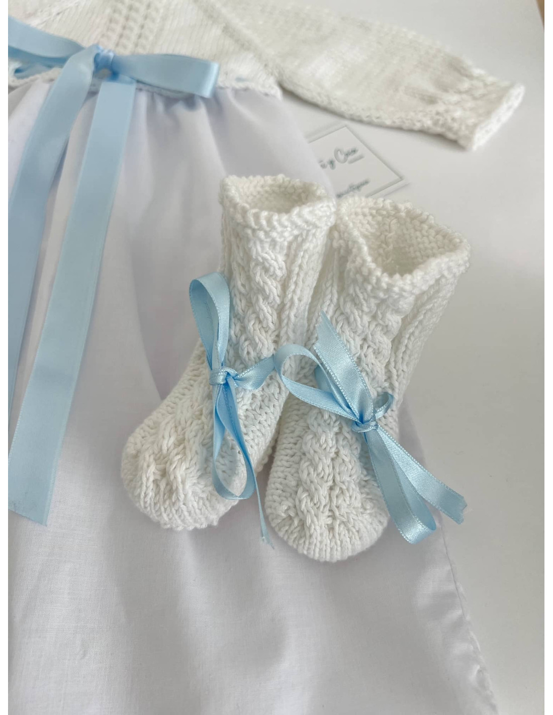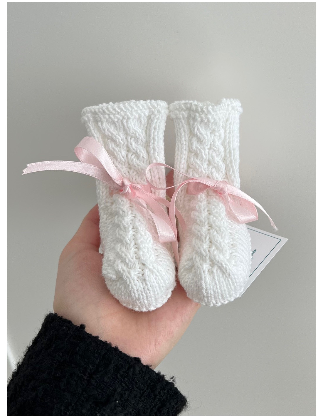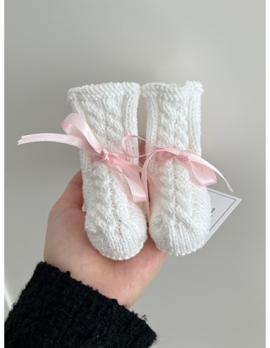 Patucos de bota tejidos a mano en algodón blanco, color del lazo a elegir. Al ser blancos son ideales para combinar con cualquier conjunto y hacerlo más especial. Es un básico en el armario de un recién nacido.