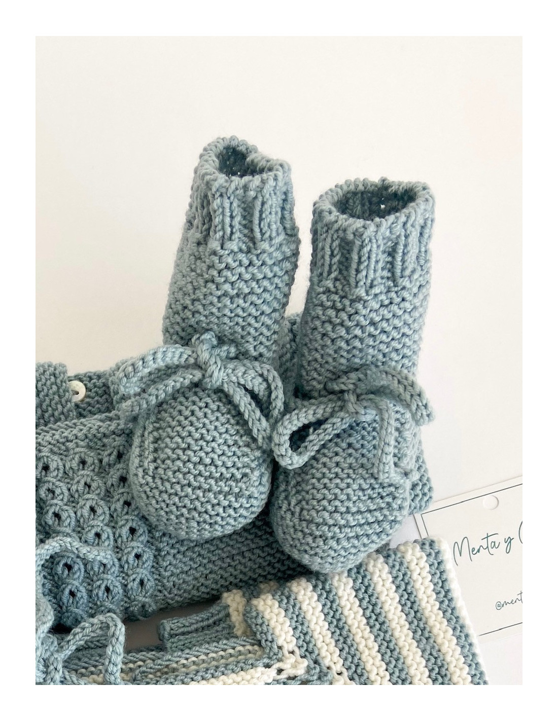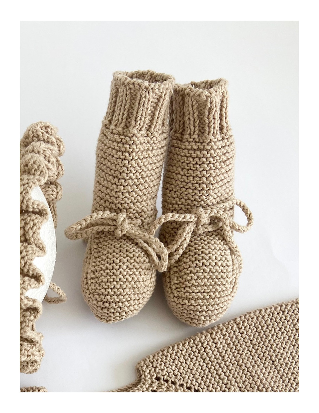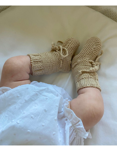 Patucos de bota con terminación de elástico, hechos a mano con un bonito lazo de punto. Todo un imprescindible en el armario de tu bebé, completa el conjunto con nuestras prendas.
