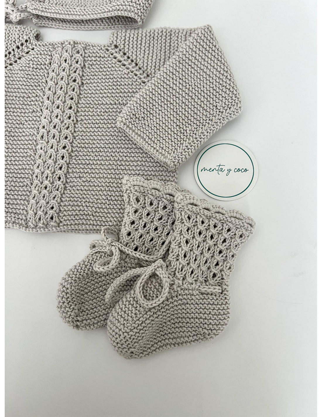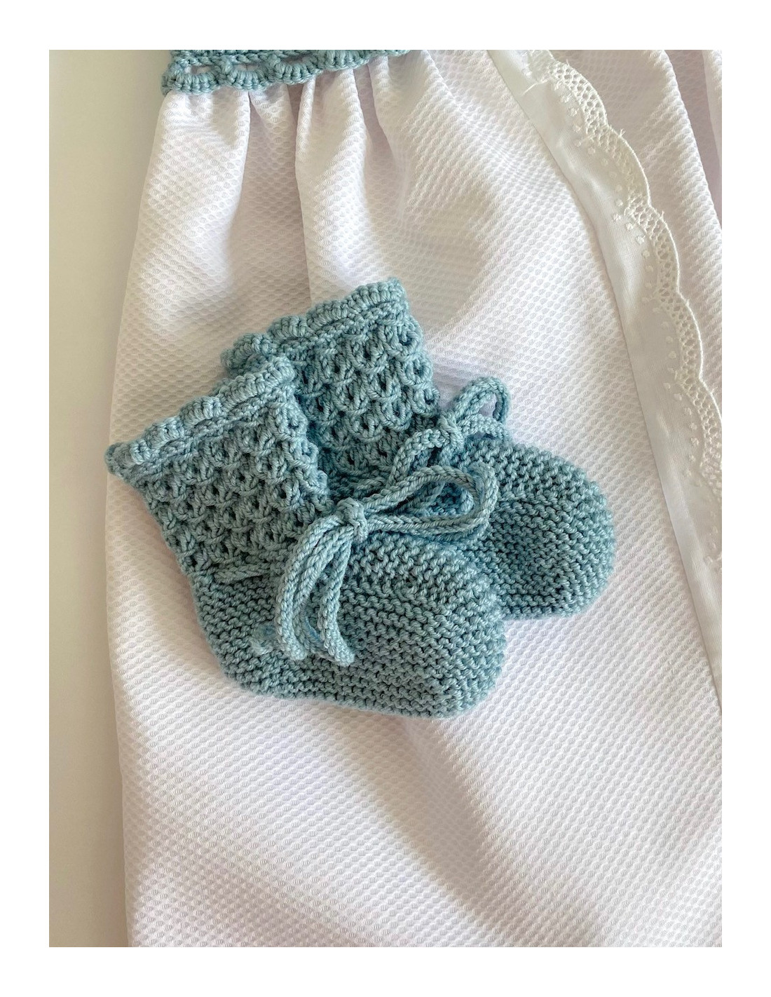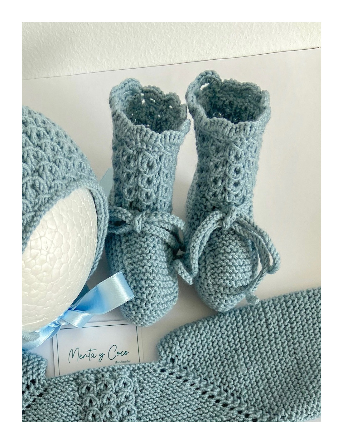 Patucos de bota con ochos y onditas alrededor, hechos a mano. Todo un imprescindible en el armario de tu bebé, completa el conjunto con nuestras prendas.