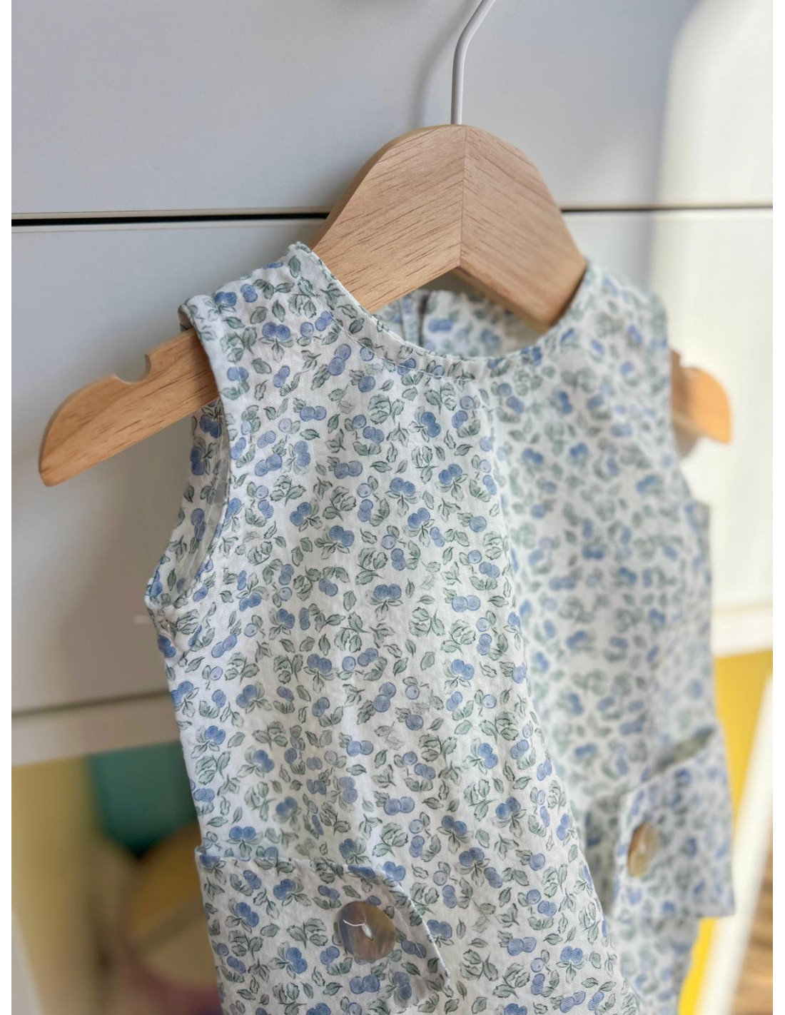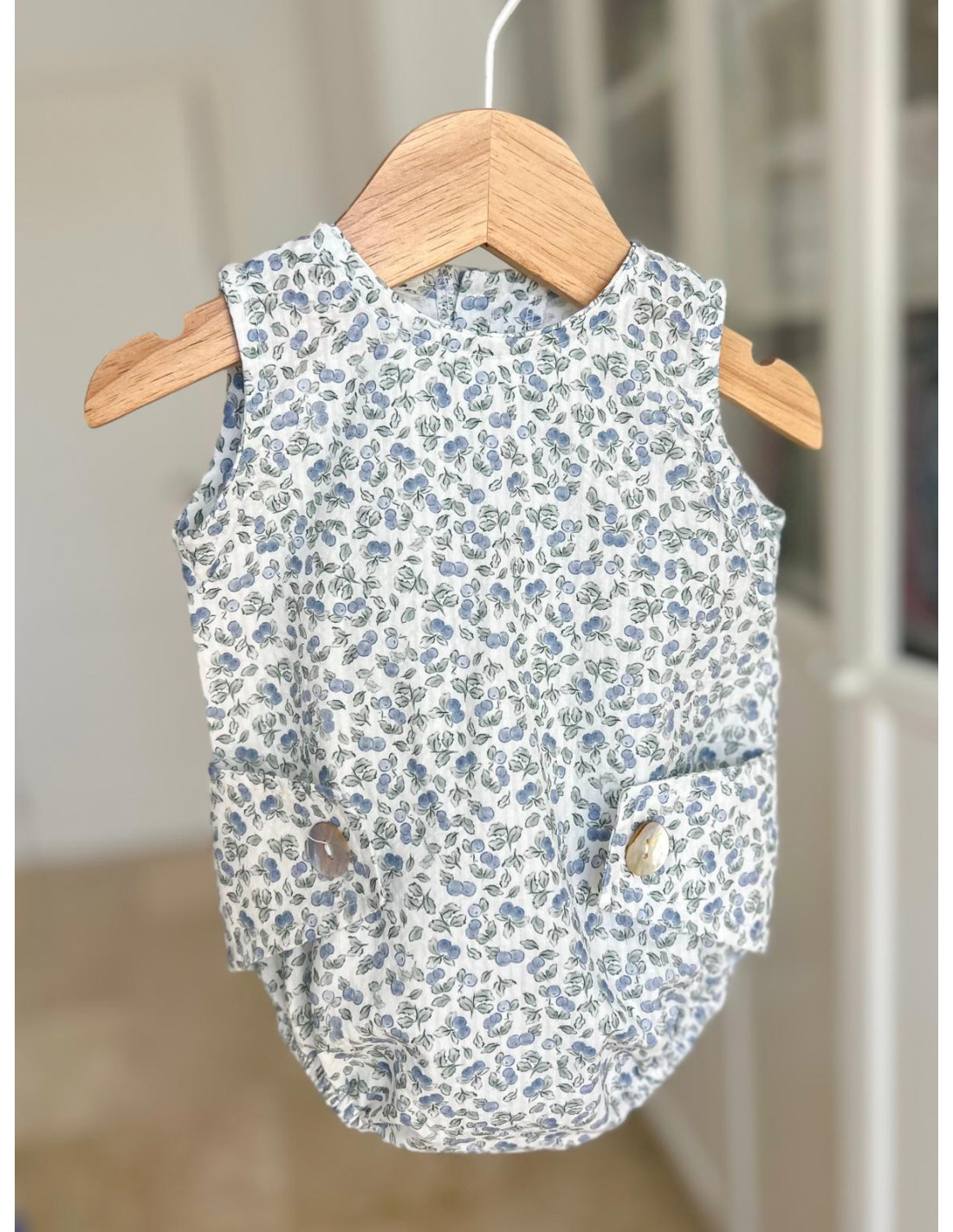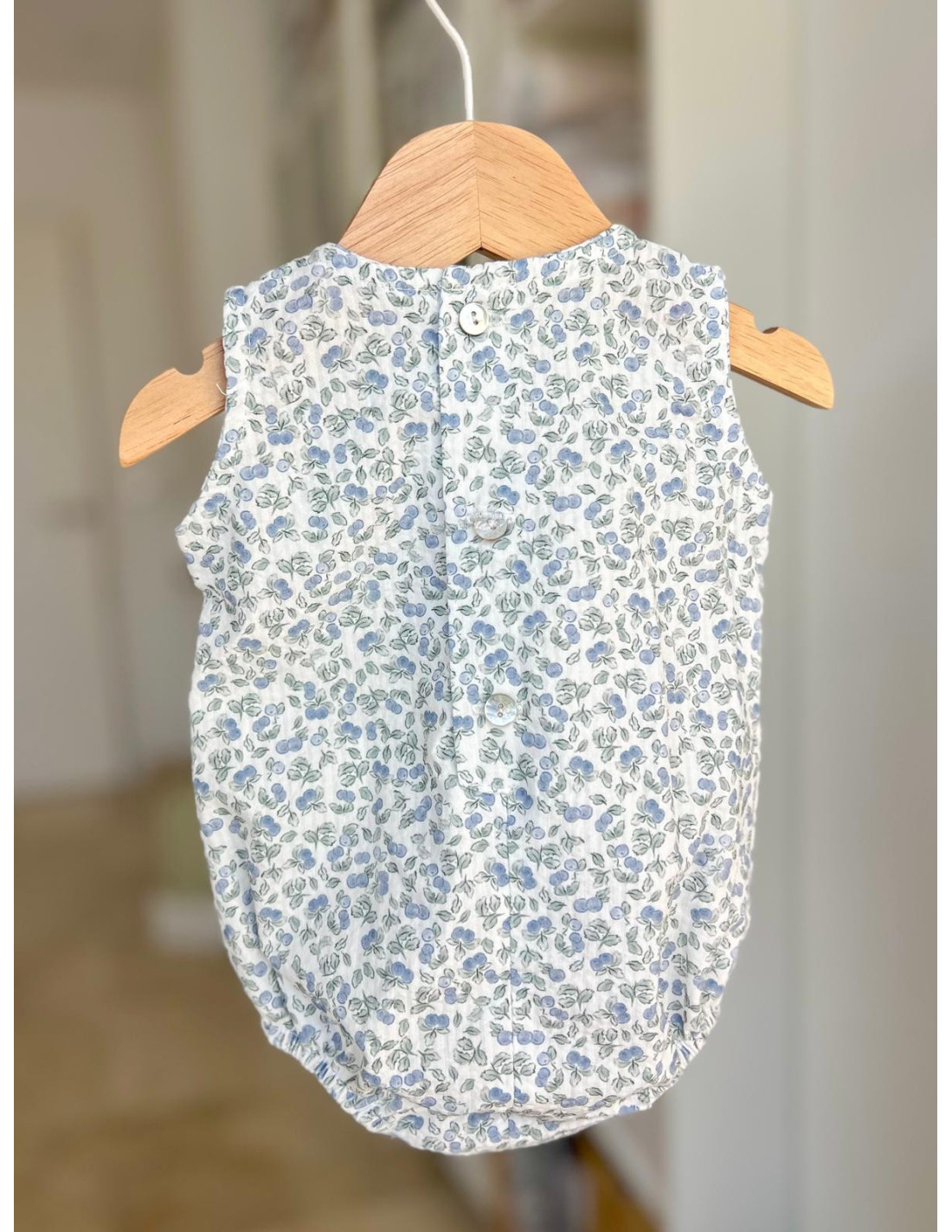 Pelele confeccionado en un tejido con tonos azules y verde empolvado, destaca por su original patrón con botones de nácar en la cintura y en la entrepierna facilitando el cambio de pañal.