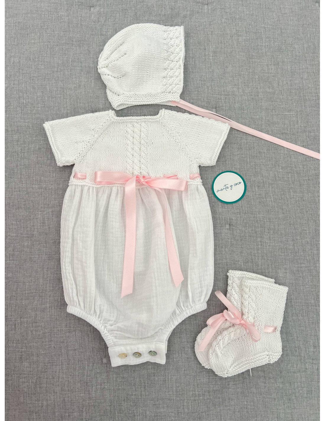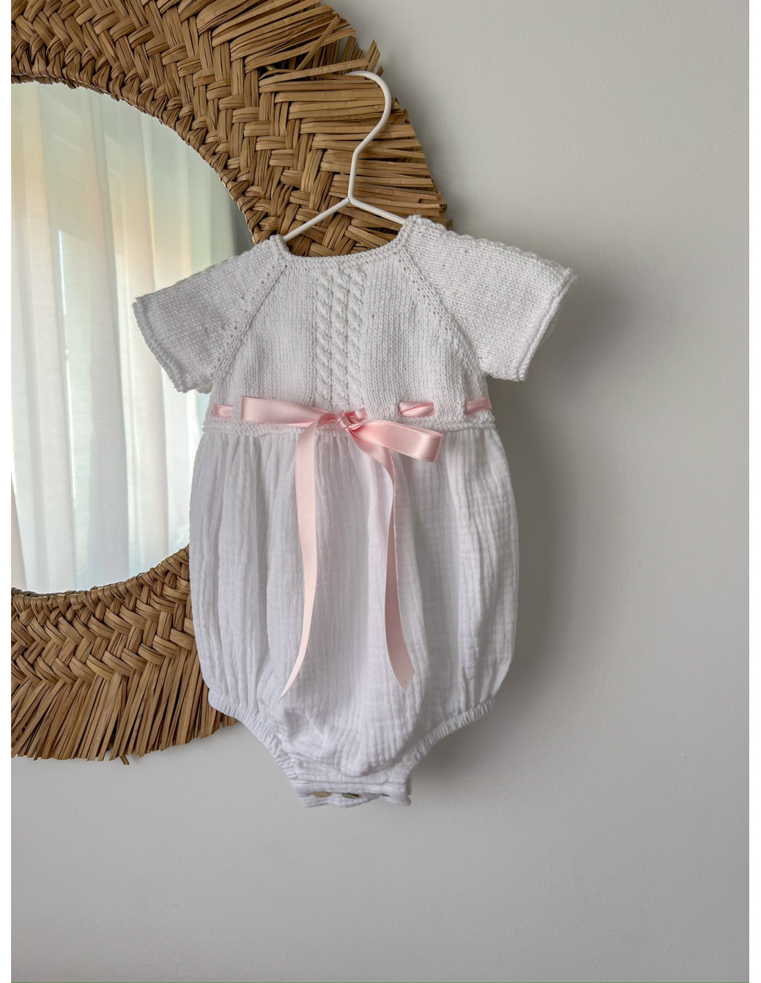 Pelele de punto combinado con tela, ¡elige el tono de lazo que más te guste!
