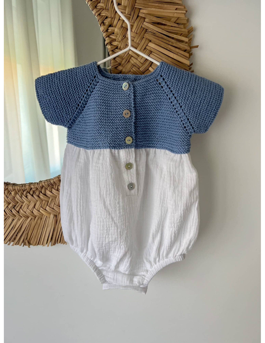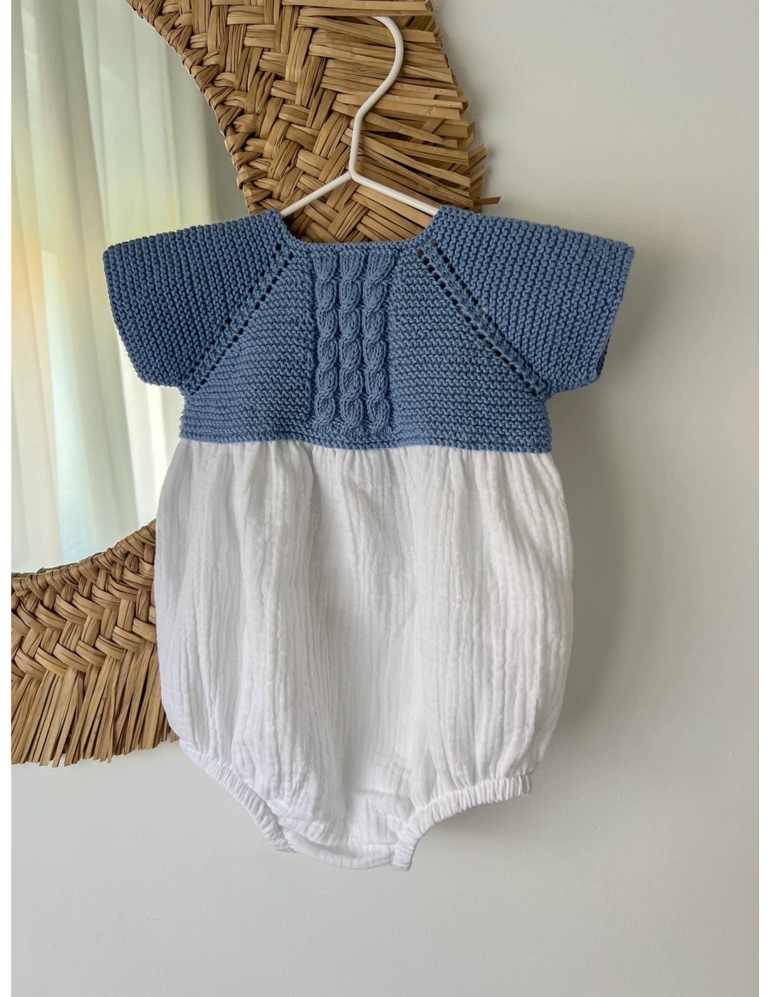 Pelele hecho a mano con trenzas en el cuerpo, un detalle diferente que lo hace más especial. Tiene abertura con botones de nácar en la entrepierna para un fácil cambio de pañal y en la espalda. Perfecto para cualquier ocasión, tu bebé irá original y diferente. Combínalo con los patucos y capota a juego.