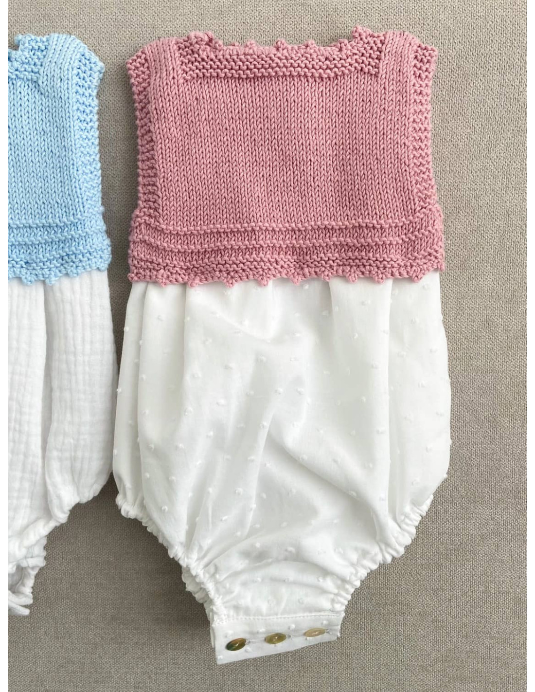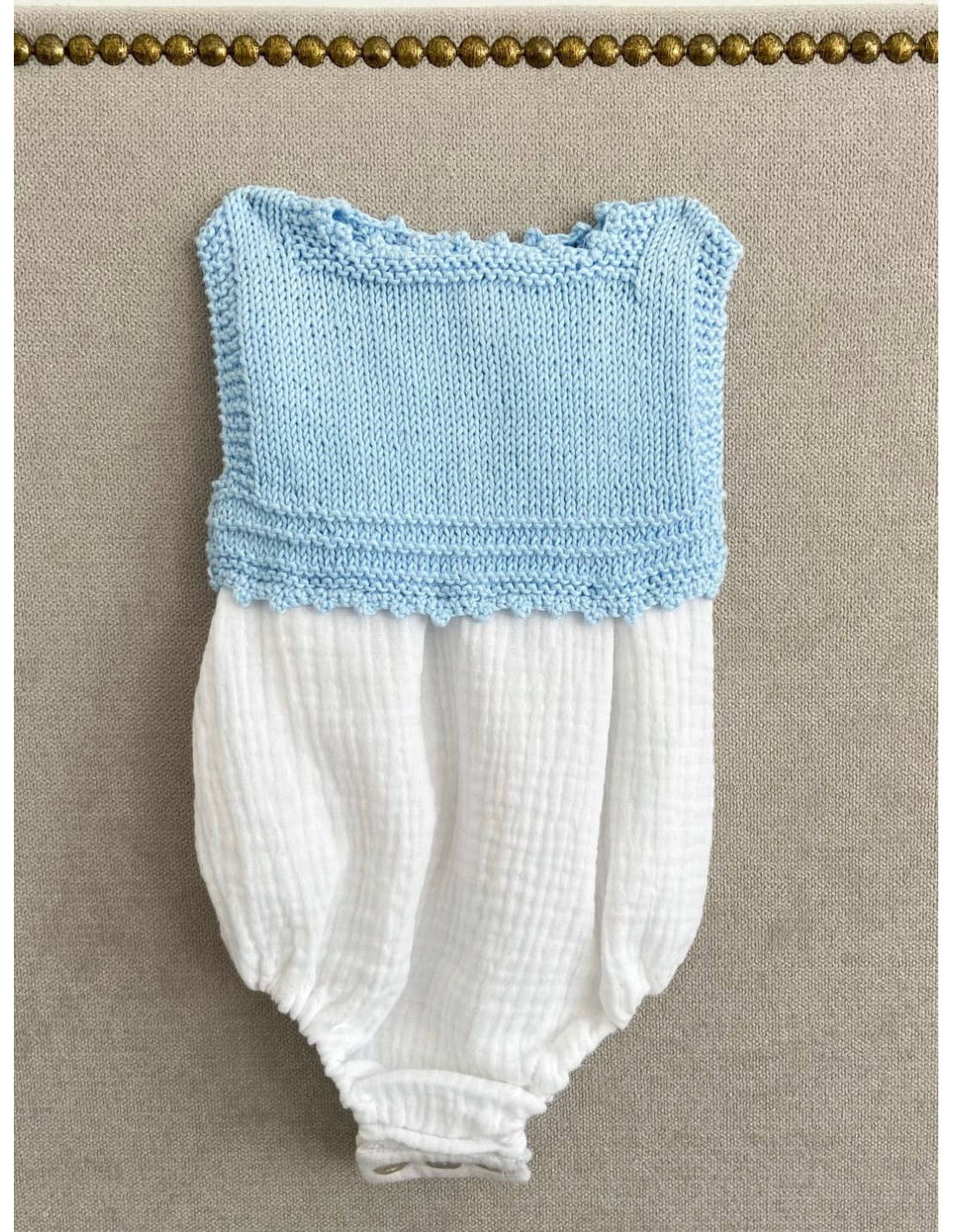 Pelele hecho a mano con un diseño muy especial y diferente. Tiene abertura con botones de nácar en la entrepierna para un fácil cambio de pañal y en la espalda. Perfecto para cualquier ocasión, tu bebé irá original. Combínalo con los patucos y capota a juego.
