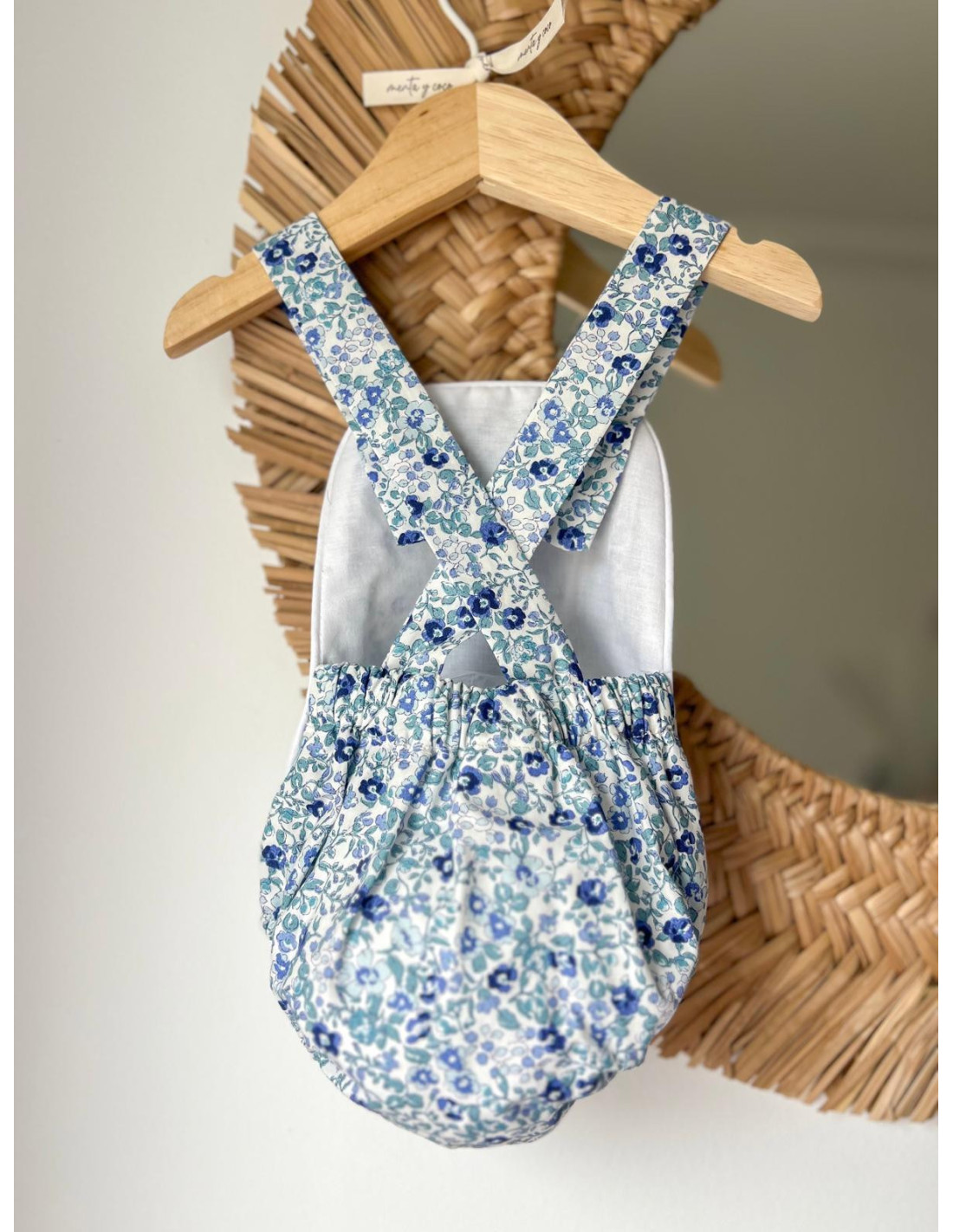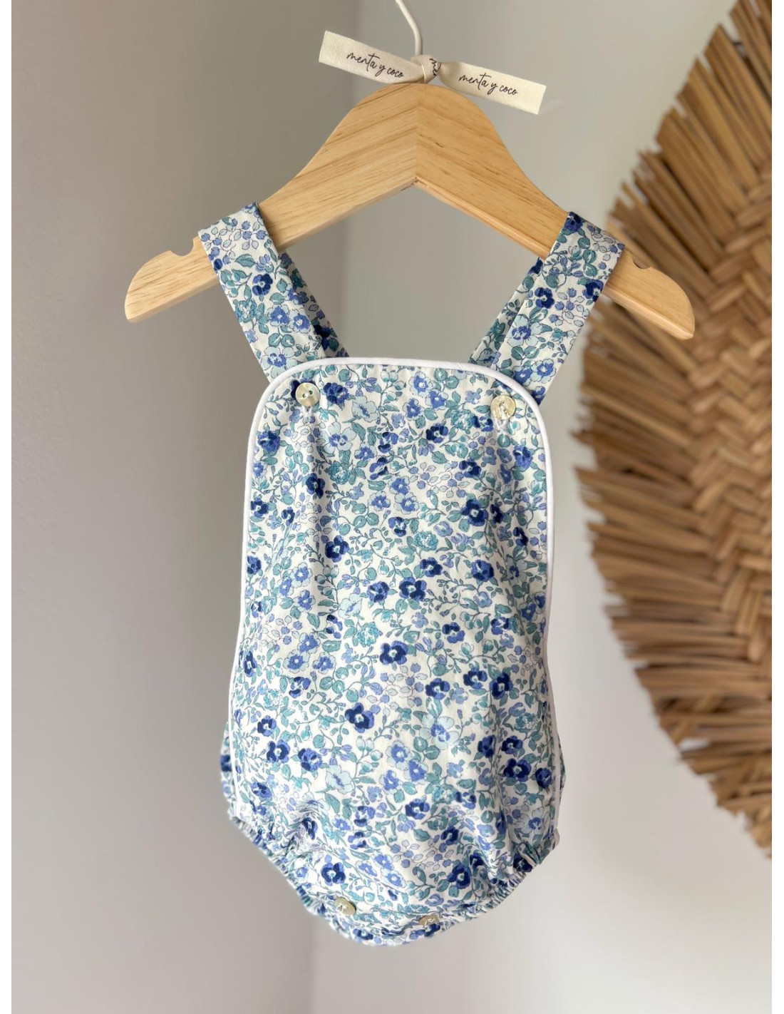 Ranita confeccionada en un original estampado de flores en tonos azulón y blanco, destaca por sus botones en la entrepierna facilitando el cambio de pañal.